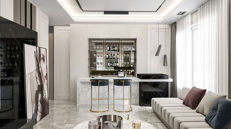 3. Ý tưởng thiết kế quầy bar mini chung cư đẹp, sang trọng
