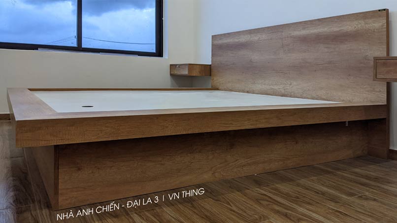 THING đã hỗ trợ anh Chiến hoàn thành một số hạng mục: Ốp cầu thang, Ốp sàn, làm tủ chân cầu thang, tủ bếp, kệ tivi, giường, tủ quần áo…