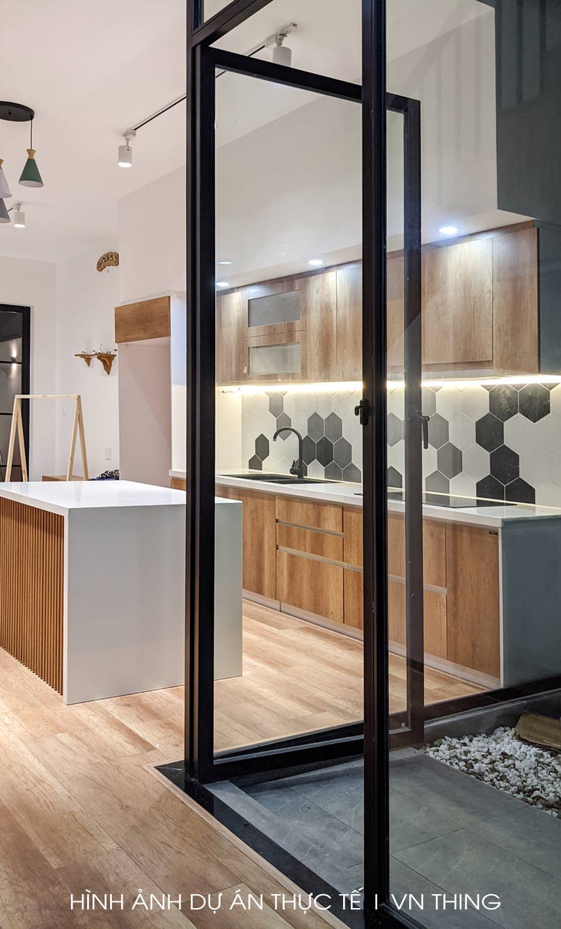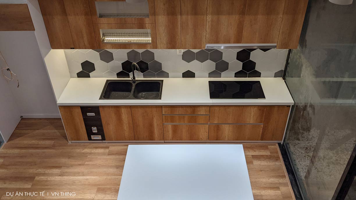THING đã sơn PU tạo màu để nó trông gần giống nhất với cánh tủ bếp và sàn gỗ.