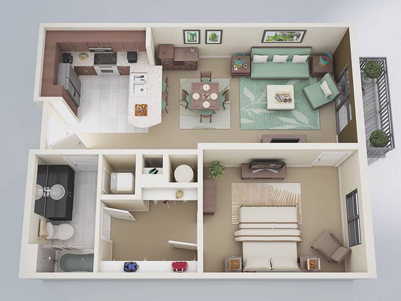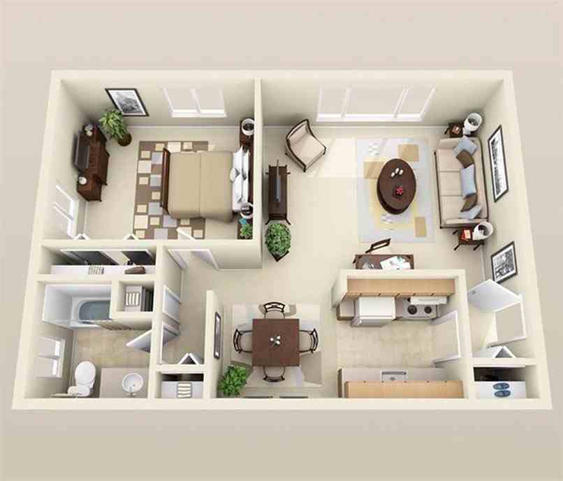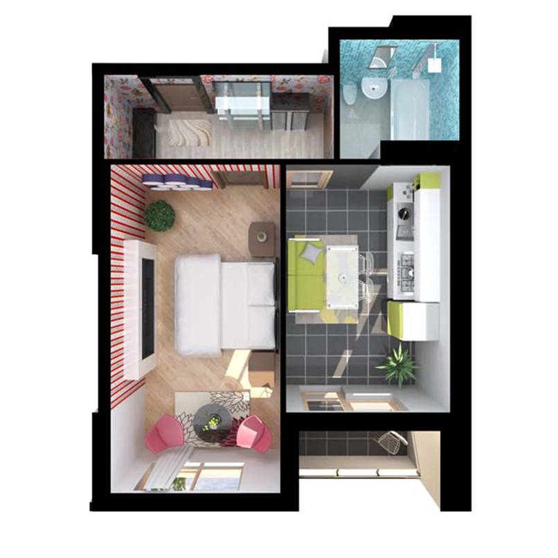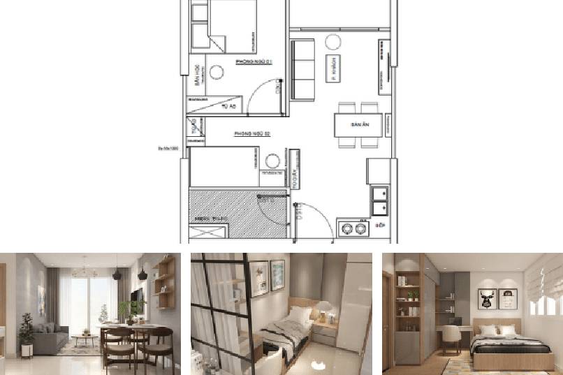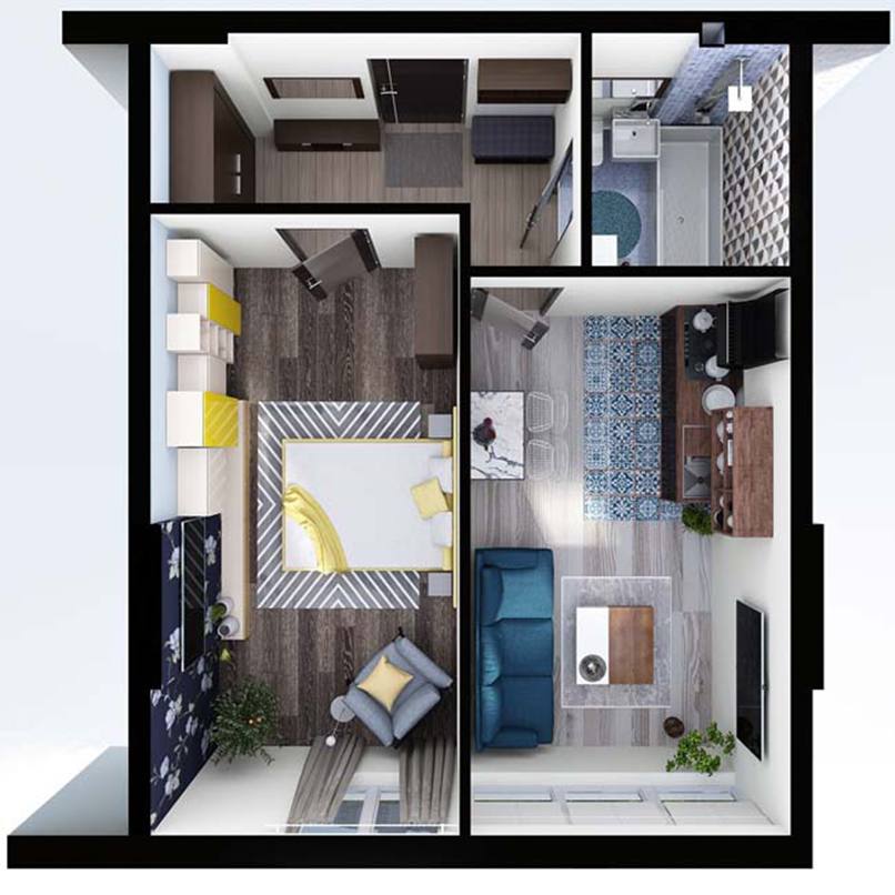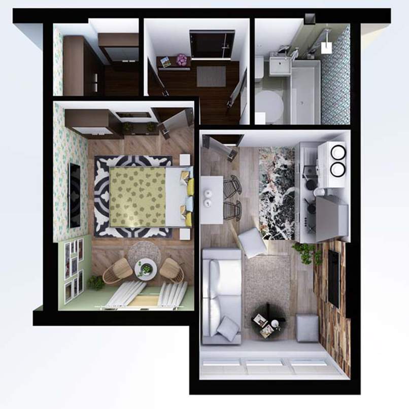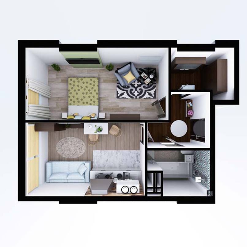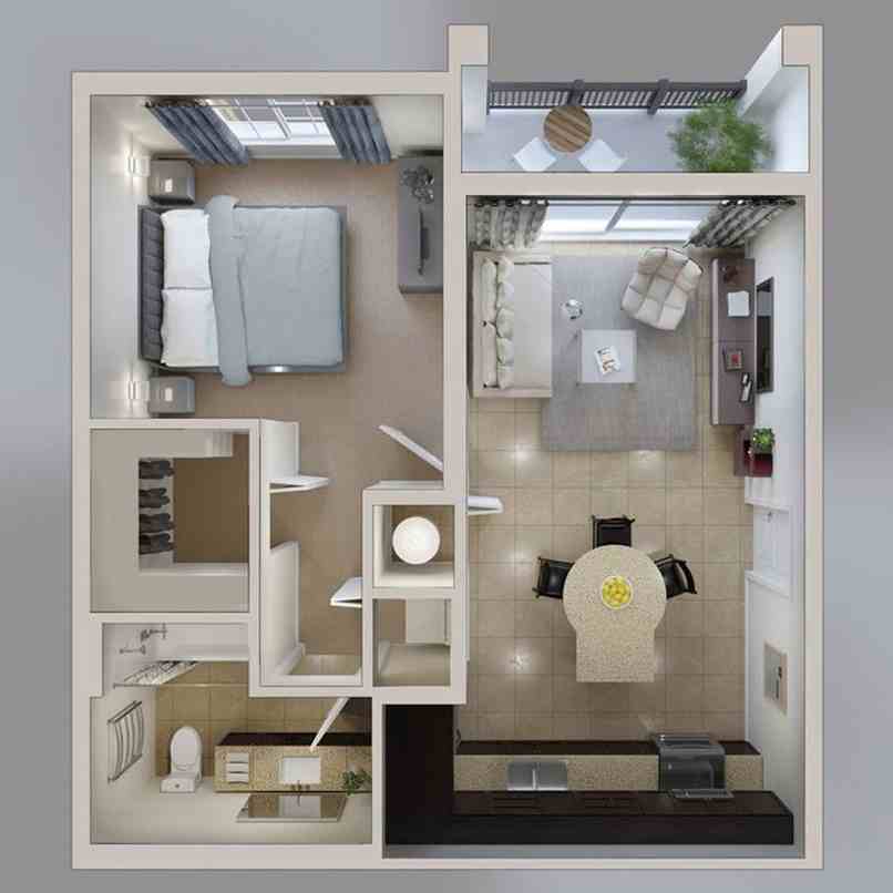 Bố cục chung cư 1 phòng ngủ thường được chia ra gồm 1 phòng khách liền bếp, 1 phòng ngủ, 1 nhà vệ sinh. Đối với những căn có diện tích trên 45m2 thì có thể bố trí phòng ngủ rộng rãi hoặc thêm phòng làm việc, phòng thay đồ hoặc phòng đọc sách tùy theo nhu cầu sử dụng.