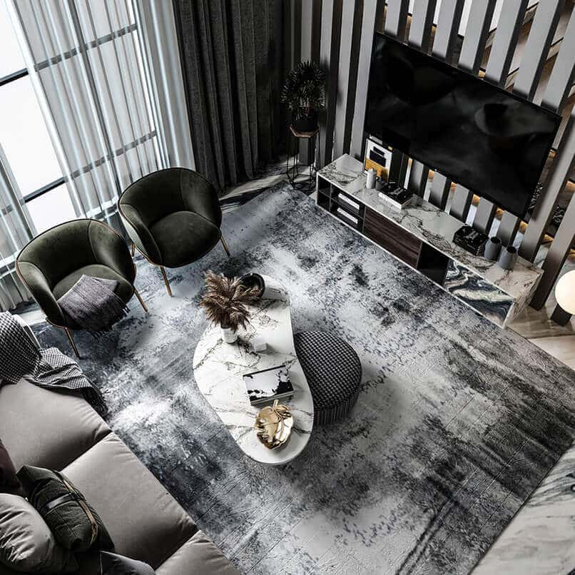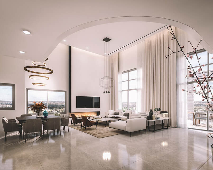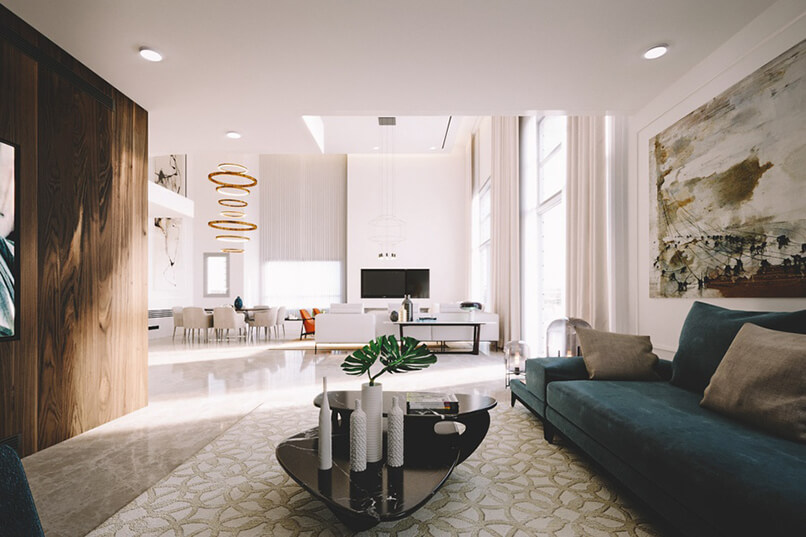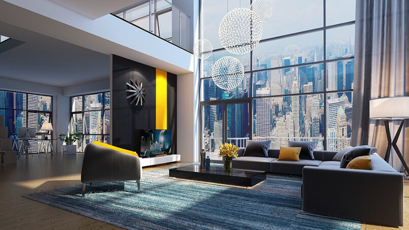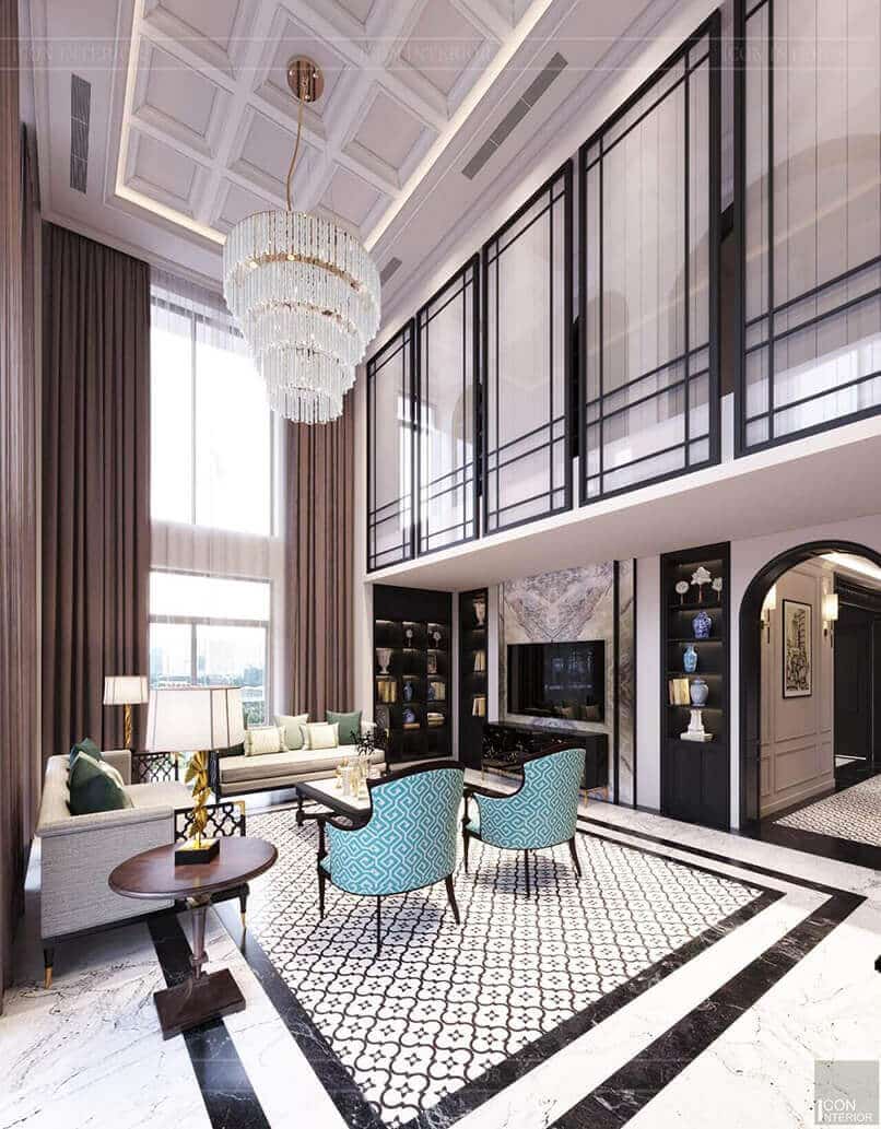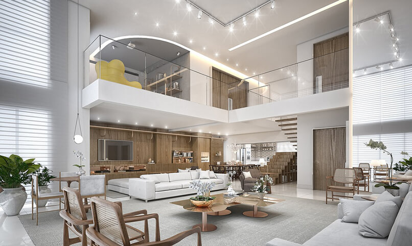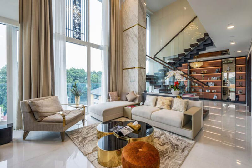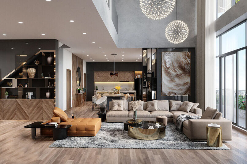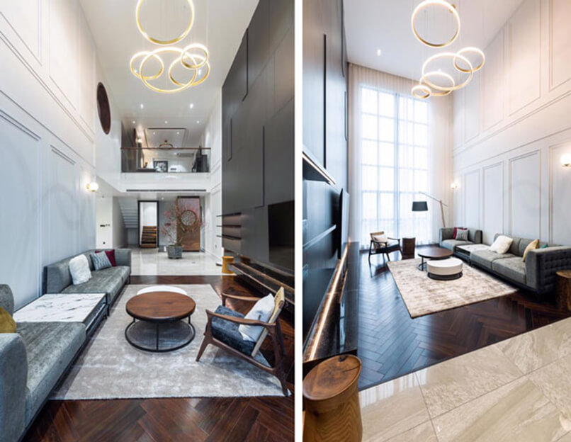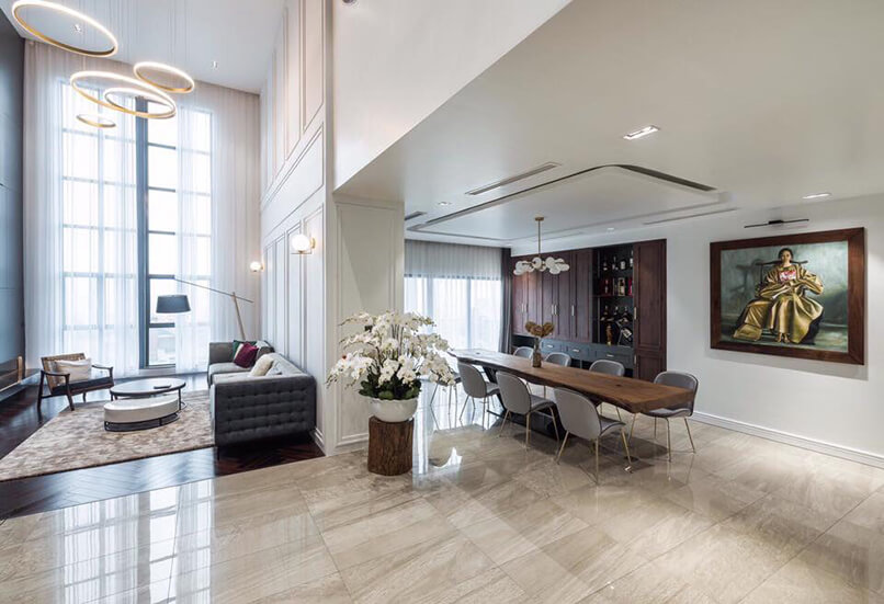 Chiều cao phòng khách. Thiết kế nội thất căn hộ duplex sang trọng hơn những căn hộ thông thường vì nó có chiều cao gấp đôi các căn hộ đó. Những bức tường cao được tô điểm bởi các vật liệu sang trọng tạo nên điểm nhấn đặc biệt.