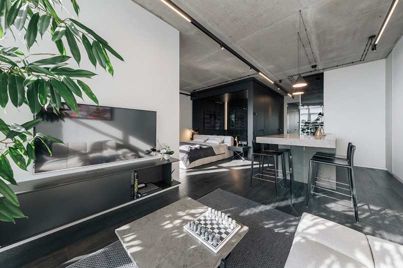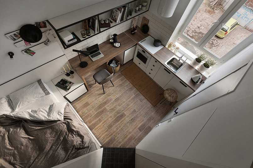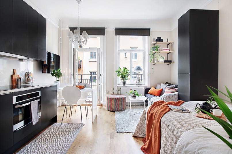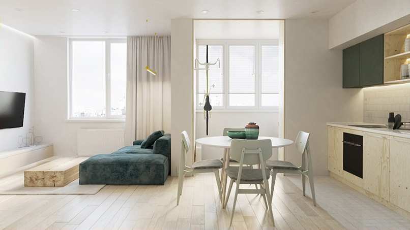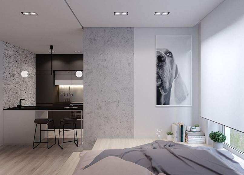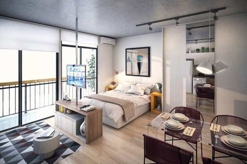 Căn hộ có diện tích nhỏ nên việc thiết kế phòng khách, phòng bếp, phòng ngủ được gói gọn chung trong một không gian. Chỉ cần một khoảng cách ngắn là có thể chuyển sang phong chức năng khác. Tạo cảm giác có thể chạm đến mọi vật, mọi vật trong tầm tay.