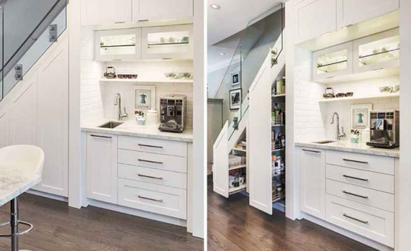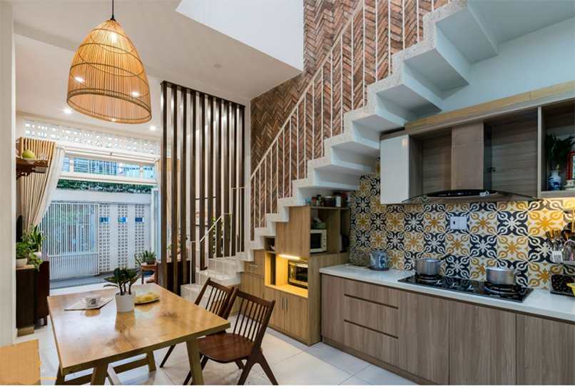 Thứ hai, tăng tính gọn gàng cho không gian. Không gian dưới gầm cầu thang thường tạo cảm giác chật hẹp, thế nhưng bạn không nên bỏ lỡ góc nhỏ này vì có thể ứng dụng vào việc bếp núc.