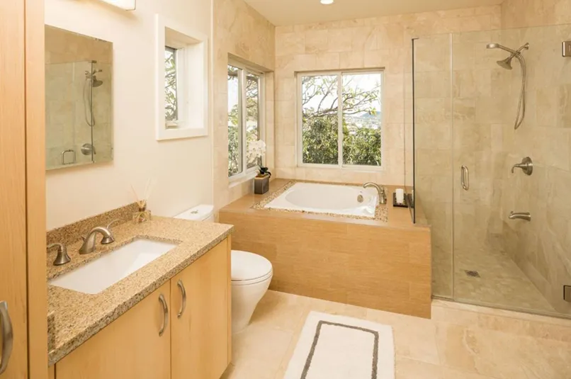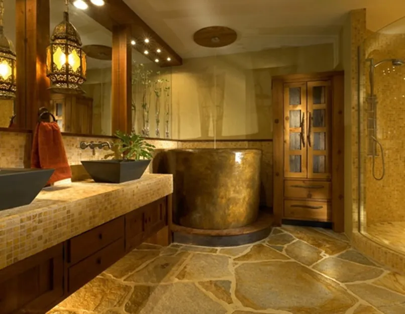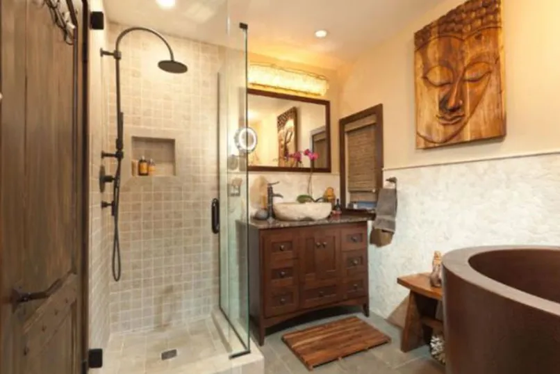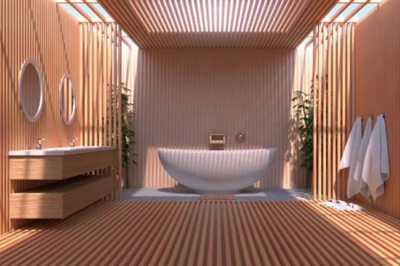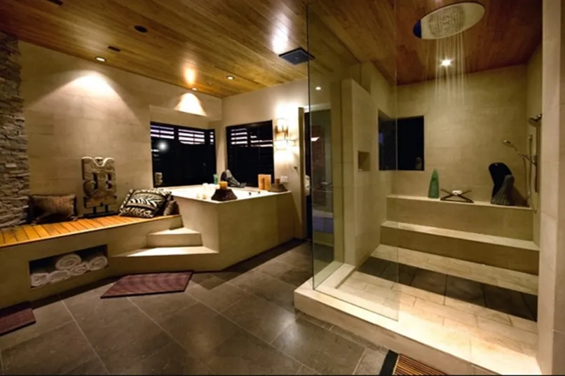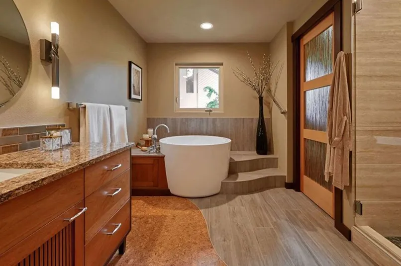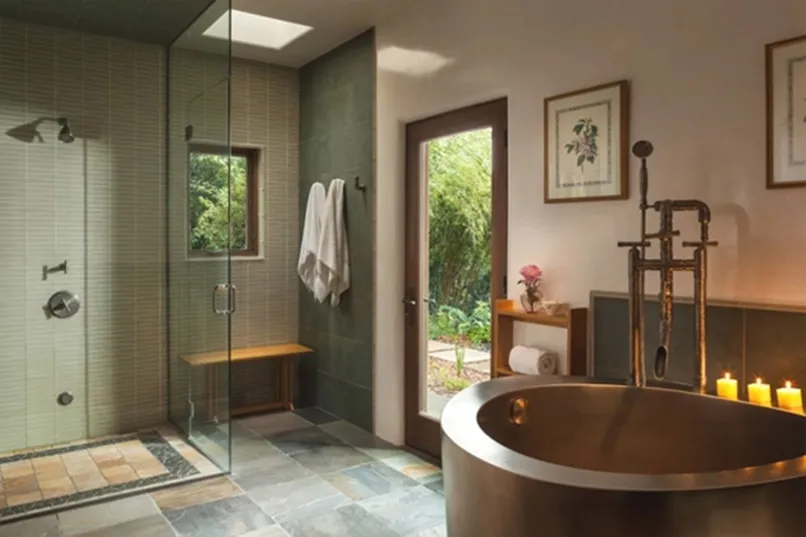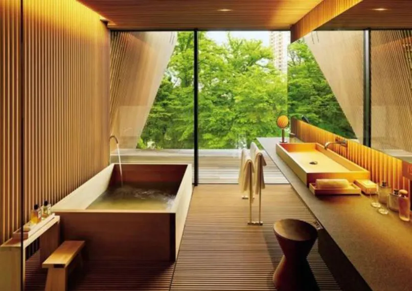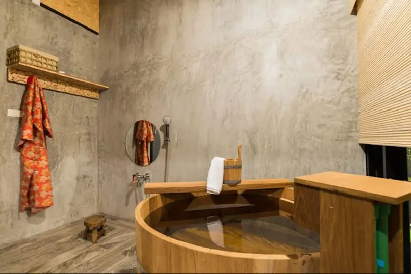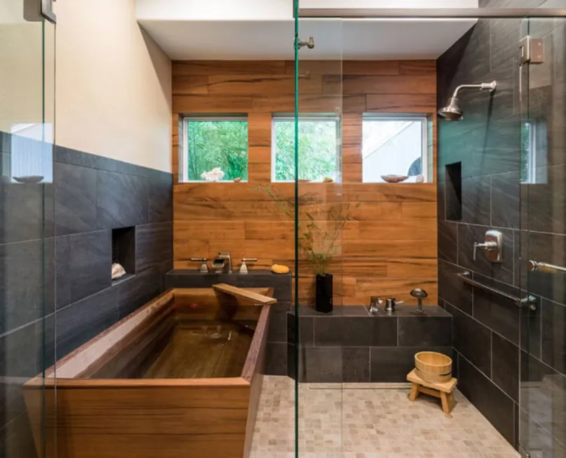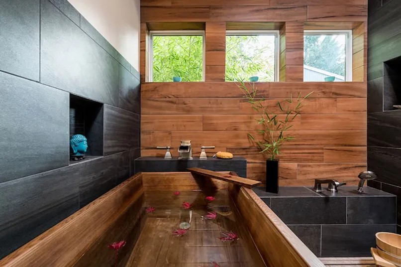 Cuối cùng, gạch ốp tường. Bồn tắm kiểu Nhật đẹp và trông lớn hơn thì bạn nên sử dụng một loại gạch hoặc đá trên tường và sàn nhà. Đá tự nhiên sẽ tạo cảm giác sang trọng như ở spa đồng thời tạo cảm giác rộng rãi cho không gian.