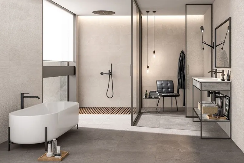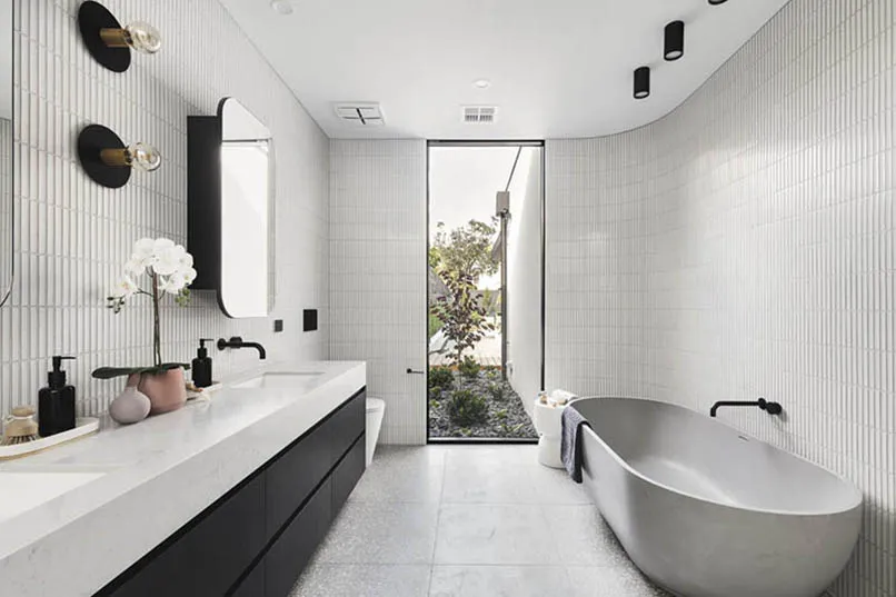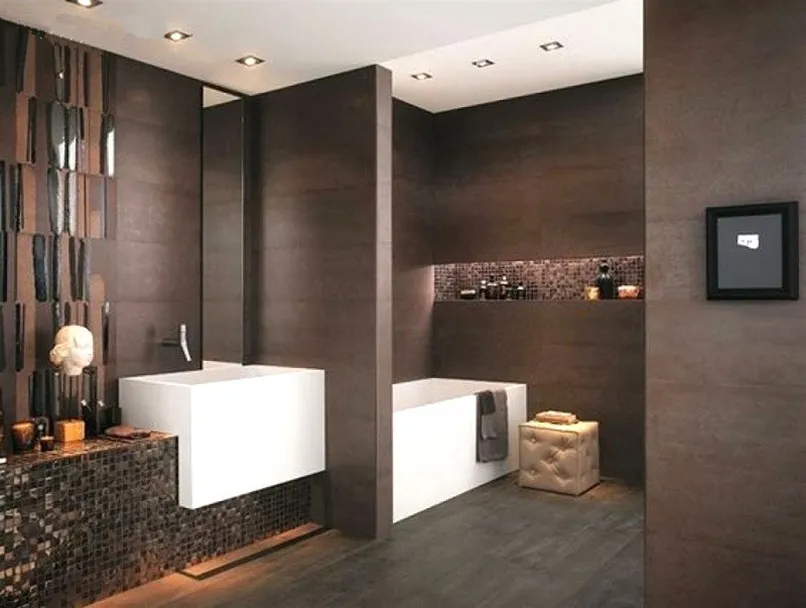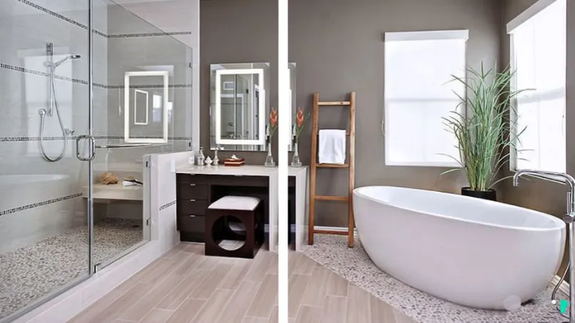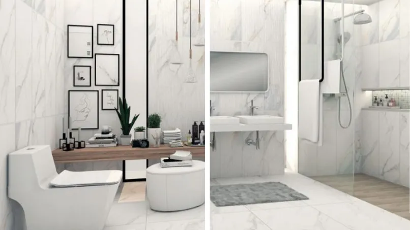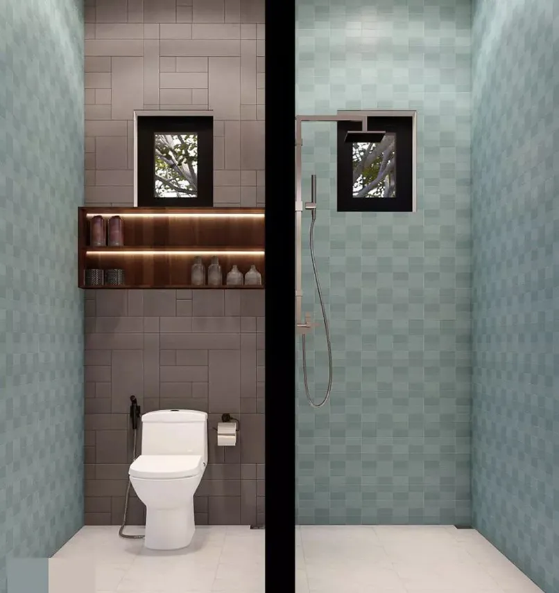 Gạch ốp tường nên chọn màu và hoa văn đồng nhất với tổng thể của căn phòng. Hãy cân nhắc lắp đặt thêm một quạt treo tường trong nhà tắm để mỗi lần vệ sinh xong sẽ nhanh khô hơn.