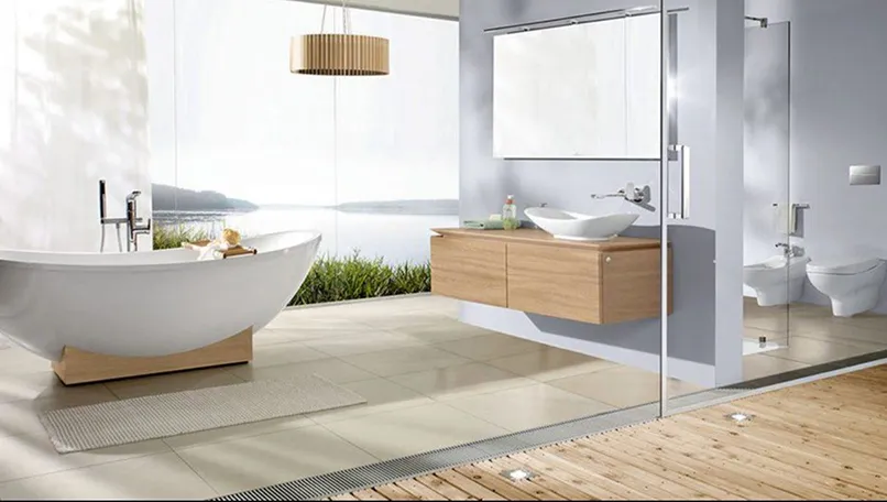 - Khu vực này thường xuyên tiếp xúc với nước nên chú ý lựa chọn những vật liệu có độ nhám vừa phải. Gạch lót cần chú ý việc chống trơn trượt, có độ bền cao, không bay màu.