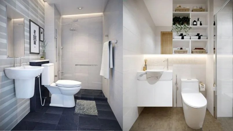 - Nhà vệ sinh diện tích nhỏ: Đối với những không gian nhỏ nhưng vẫn muốn thiết kế nhà vệ sinh và nhà tắm riêng thì cần chú ý bố trí vật dụng tối giản để tránh trường hợp mọi thứ chồng chéo lên nhau.