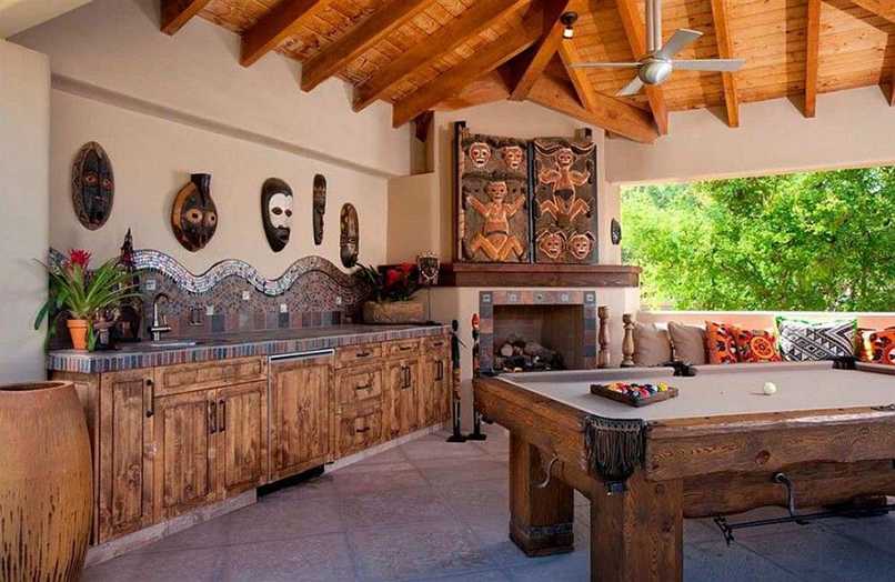 Ngoài ra, nó có một hình dạng hình học. Đồ nội thất có thể được bổ sung bằng tranh hoặc chạm khắc. Đồ nội thất bằng sắt rèn cũng như đồ đan lát với nệm và gối mềm, chăn treo lơ lửng là thích hợp trong nội thất. Đồ nội thất được bọc bằng da màu nâu sẫm cũng như đồ nội thất bằng tre trông sẽ rất tuyệt.