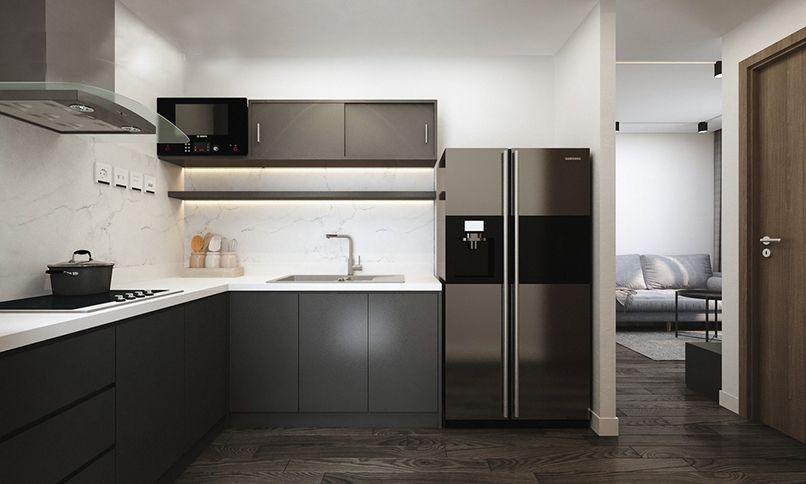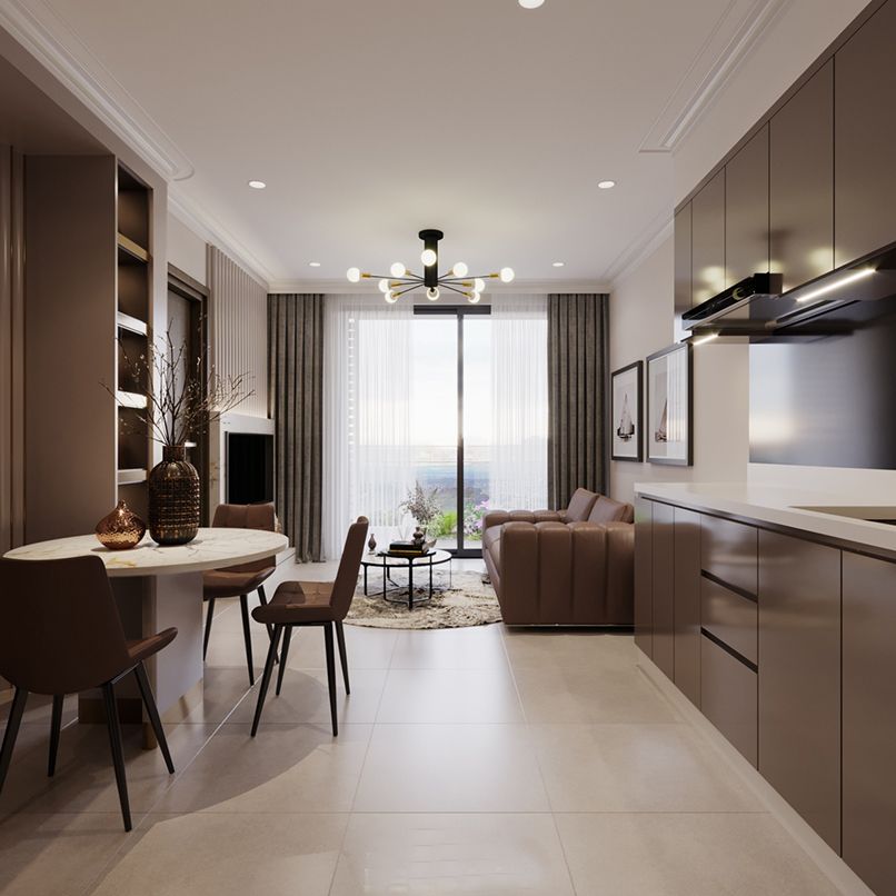 - Một phòng khách liền kề nhà bếp và nhà vệ sinh chung có diện tích từ 20 đến 25m2
