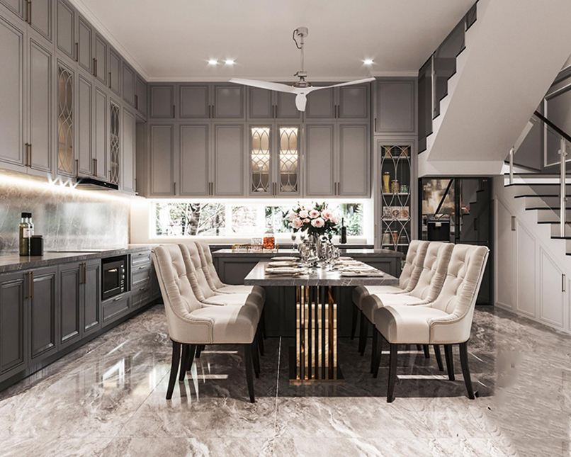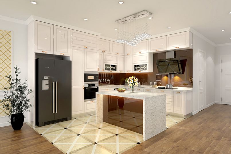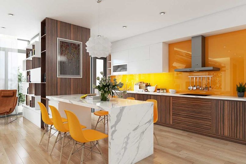 Hơn thế nữa, để đảm bảo chịu đựng được nhiệt độ cao và độ bền bỉ theo thời gian cho thiết kế nội thất phòng bếp thì nên chọn các bề mặt đá Marble, Granite, đá hoa cương,… Bên cạnh đó, bạn có thể linh hoạt chọn kệ, mặt bếp được mở rộng hơn phù hợp với túi tiền của bạn.