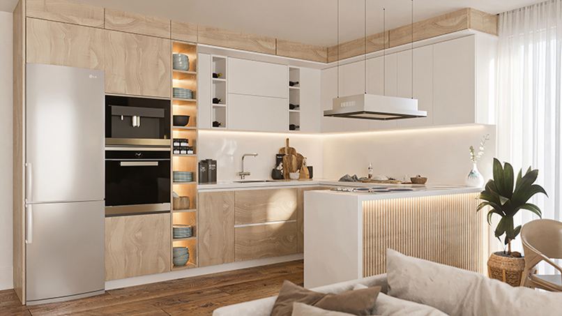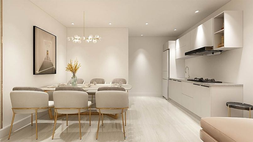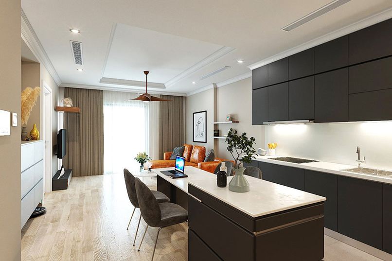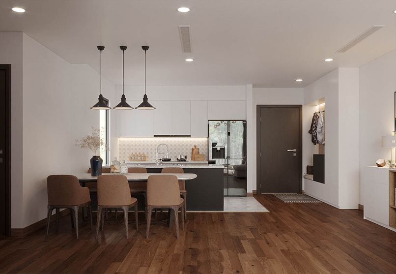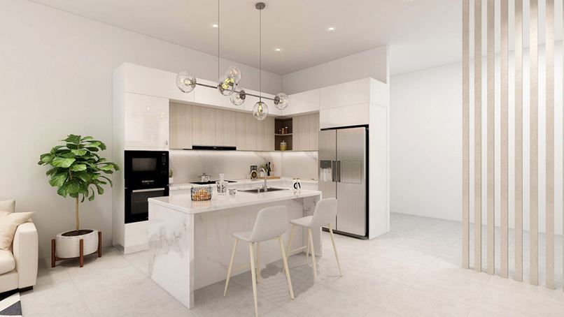 Thiết kế nội thất phòng bếp theo không gian mở giúp tăng diện tích phòng, tạo chiều sâu và mở rộng tầm nhìn cho không gian tổng thể. Hơn nữa, thiết kế kiểu này dễ khiến các thành viên trong gia đình kết nối, tương tác, trò chuyện một cách dễ dàng.