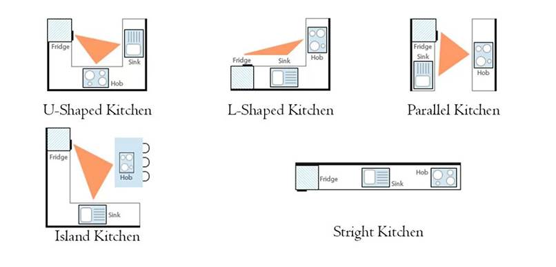 Tuỳ theo kiểu dáng tủ bếp sẽ có các cách sắp xếp vị trí của tam giá bếp khác nhau sao cho phù hợp. Đối với những tủ bếp chữ U, bồn rửa sẽ được bố trí nằm giữa, hai bên là tủ lạnh và bếp đối diện nhau.
