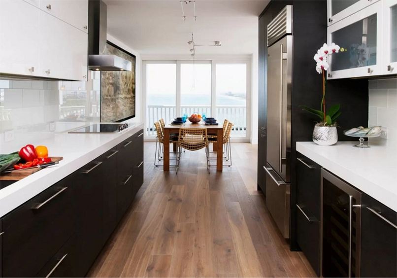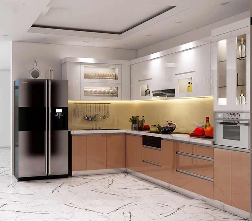 Đối với những tủ bếp chữ L thì tủ lạnh và bồn rửa sẽ nằm chung một bên, bên còn lại sẽ bố trí bếp nấu để rút ngắn khoảng cách di chuyển cho người đứng nấu. Bố trí đồ dùng, vật dụng trong nhà bếp theo nguyên tắc này cần chú ý những điều như: