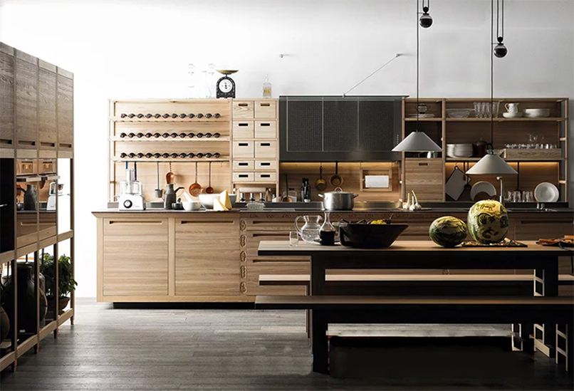 Thứ năm, chọn chất liệu đồ nội thất phòng bếp. Cho đến hiện tại, nhiều người nghe đến vật liệu làm nội thất bếp thường nghĩ đến các vật liệu như gỗ công nghiệp MDF, gỗ HDF phủ Acrylic. Nhưng xu hướng hiện đại đang dần đơn giản hoá bằng các vật dụng thiên nhiên như: tre, đá, mây, nứa,… được ưa chuộng hơn cả. Điều này vừa đảm bảo vẻ đẹp thẩm mỹ mà lại hạn chế việc phải sửa chữa, cải tạo thường xuyên.
