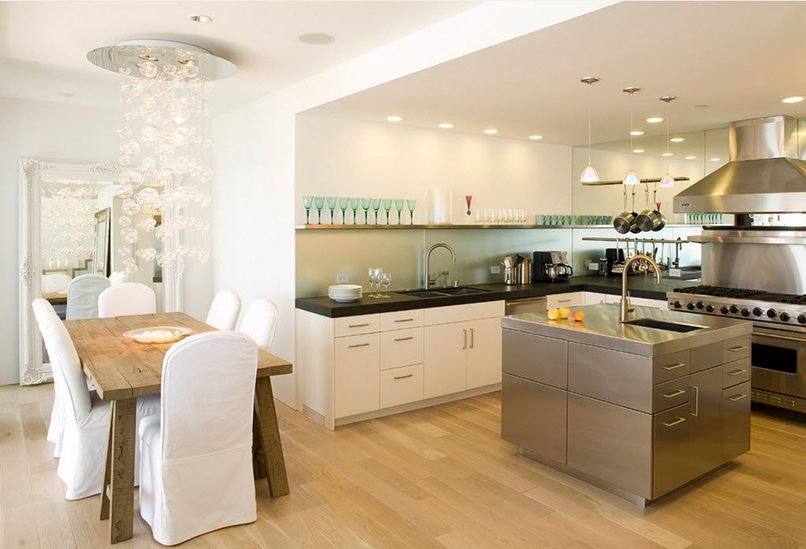 Trong những căn chung cư nhiều tầng thường được thiết kế tiêu chuẩn lỗi thời, về nguyên tắc không cung cấp các không gian rộng rãi. Và điều này được sử dụng khắp nơi trên thế giới. Vì vậy chỉ với chi phí của diện tích sử dụng các phòng khác, bạn có thể đạt được sự mở rộng của nhà bếp trong trường hợp này. Cách phổ biến nhất là loại bỏ các rào cản giữa phòng khách và nhà bếp để kết hợp chúng thành một khu vực chức năng liên tục.