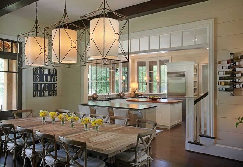 Khi thiết kế phòng bếp và phòng khách kết hợp cần đặt biệt chú ý đến ánh sáng. Suy cho cùng, ánh sáng đóng vai trò quan trọng trong việc phân chia các khu vực chức năng. Và điều rất quan trọng là phải giữ được sự cân bằng phù hợp giữa ánh sáng chói và những đoạn nhẹ nhàng hơn. Vì vậy, một chiếc đèn chùm thanh lịch khác thường hoặc quyến rũ phát ra ánh sáng rực rỡ nên có cho nhà bếp. Trong khi đó, một số loại đèn khác cũng mang lại sự chuyển tiếp mượt mà sang ánh sáng dịu nhẹ ở các khu vực như quầy bar, bàn, bồn rửa….