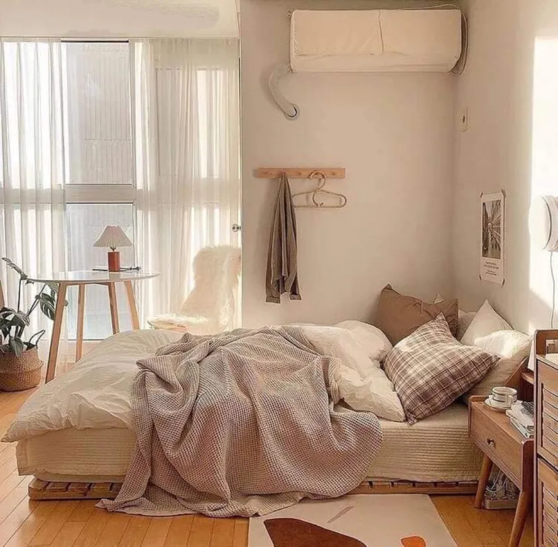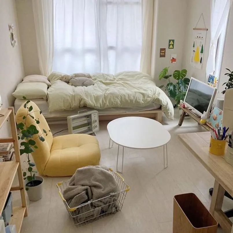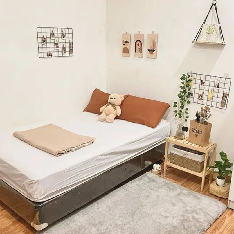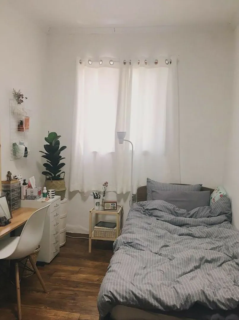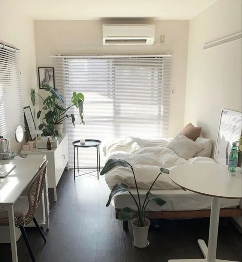 Đối với những không gian hẹp như thế này thì đừng bao giờ đặt giường ở giữa phòng, không có điểm tựa nhé. Vì nó không chỉ gây bất tiện cho việc di chuyển mà còn khiến căn phòng chật hơn, giường lại không có điểm tựa khiến giấc ngủ không thoải mái.