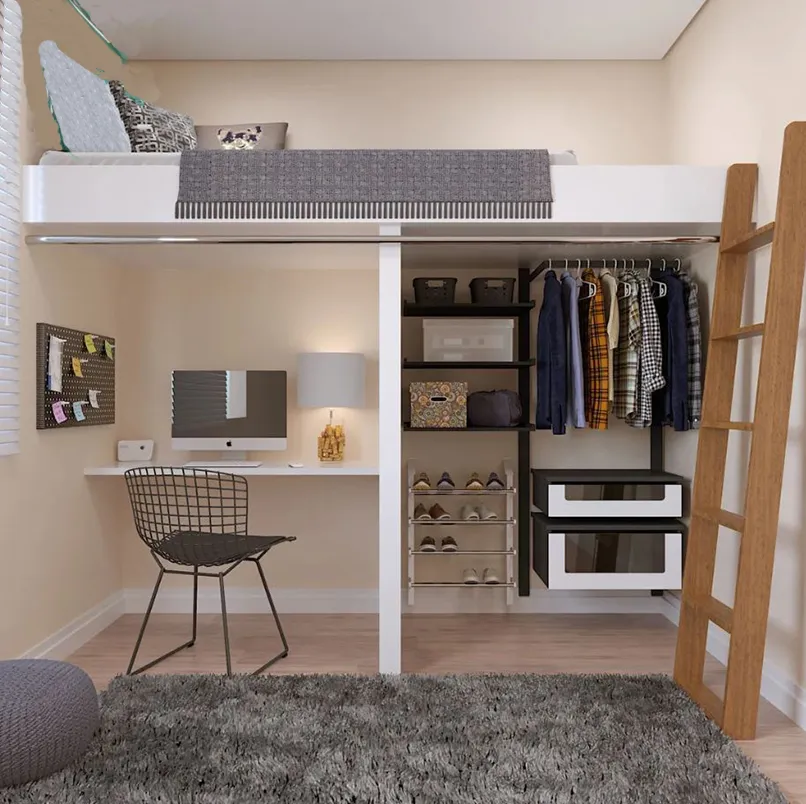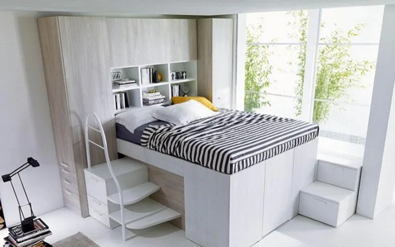 Một chiếc giường có phần tủ phía dưới, nhiều ngăn kéo để có thêm không gian chứa đồ đạc cá nhân mà không gây cảm giác bừa bãi. Giường tầng kết hợp bàn làm việc cũng là một ý tưởng tuyệt với trong những không gian như thế này.