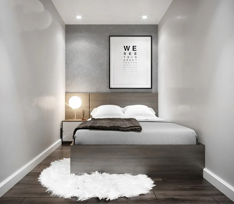 Đối với cách thiết kế nội thất phòng ngủ 9m2 chúng ta nên đặt giường cố định sát giường. Ưu tiên tận dụng không gian treo tường và trần nhà, đồ vật treo tường giúp tiết kiệm không gian và tận dụng được diện tích của phòng một cách tối đa.