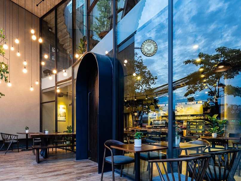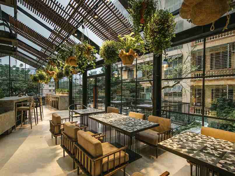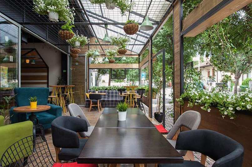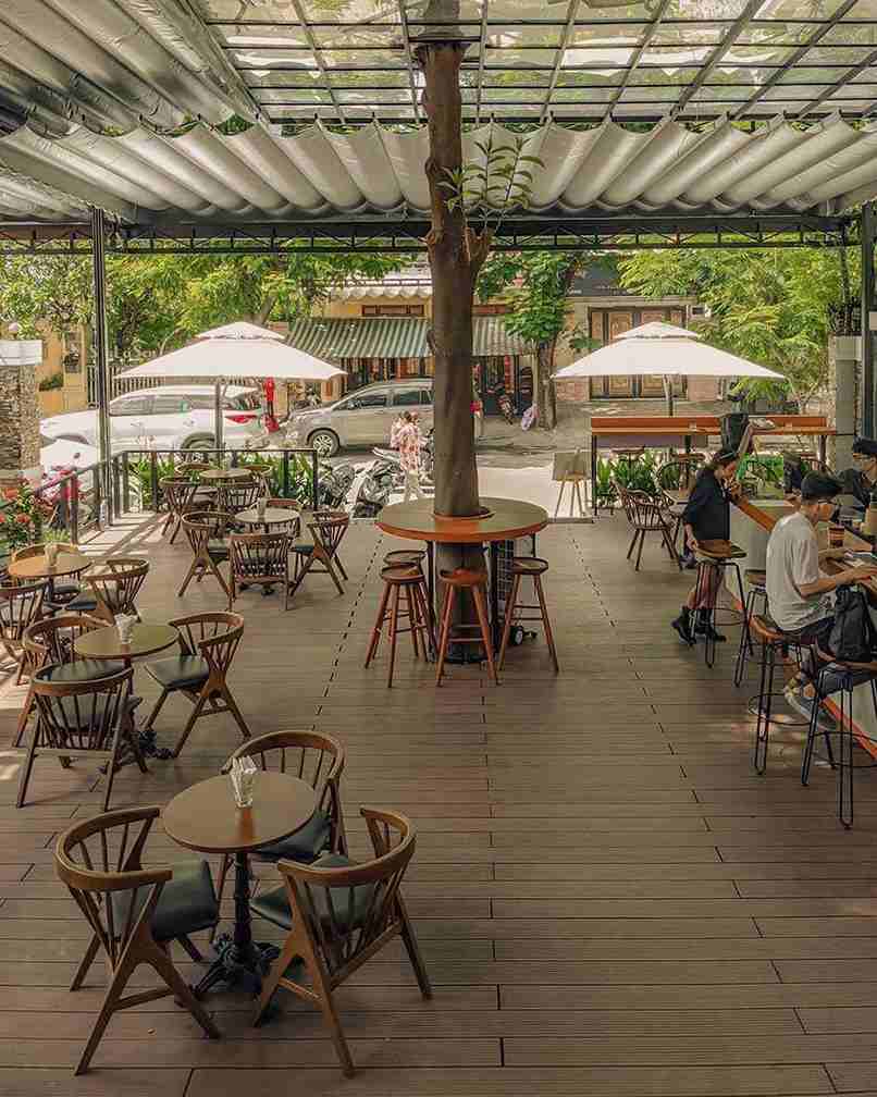 - Thiết kế quán cà phê ngoài trời luôn mang lại sự mát mẻ, thoáng đãng. Đây cũng là đặc trưng nổi bật của các thiết kế phòng kín không có. Quán không bị ngăn cách bởi những bức tường cao, kính tạo không khí thông thoáng.