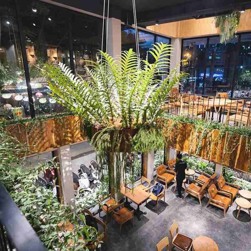 Việc sử dụng cây xanh sẽ giúp cho quán cà phê có không gian xanh, tạo bầu không khí trong lành. Đừng nghĩ việc bố trí thật nhiều cây xanh trong khu vực khách ngồi để tạo không gian mát mẻ, thoáng đãng.