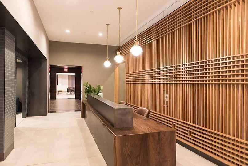 Thông thường, quầy lễ tân khách sạn sẽ cách cửa ra vào một khoảng vừa đủ không được quá xa cũng không quá gần. Điều này sẽ đảm bảo tính riêng tư cần thiết cho nhân viên đồng thời có thể bài trí bức tường để làm điểm nhấn.