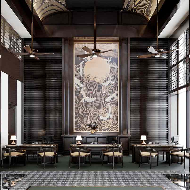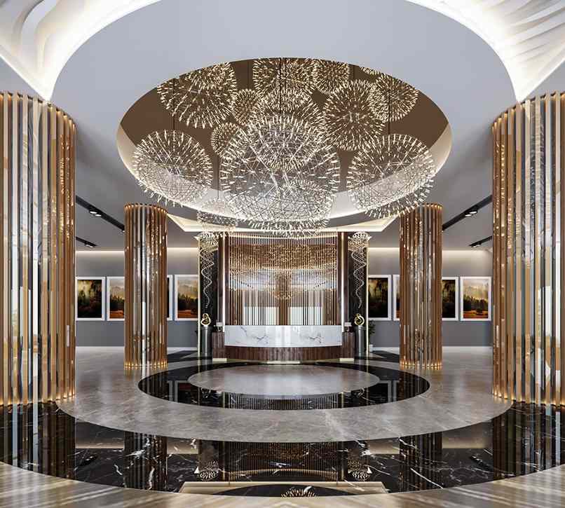 Thứ năm, tạo điểm nhấn cho khu vực quầy lễ tân khách sạn. Điểm nhấn khu vực quầy lễ tân khách sạn thường đến từ đèn thả trần ấn tượng, tranh…