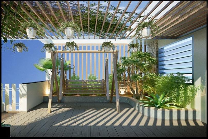 Tận dụng tối đa không gian dọc sẽ khiến sân thượng trở thành không gian thoáng đãng, mát mẻ và dễ chịu hơn hẳn. Thay vì việc để trống một cách buồn tẻ và u ám.
