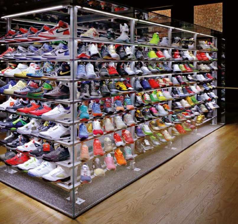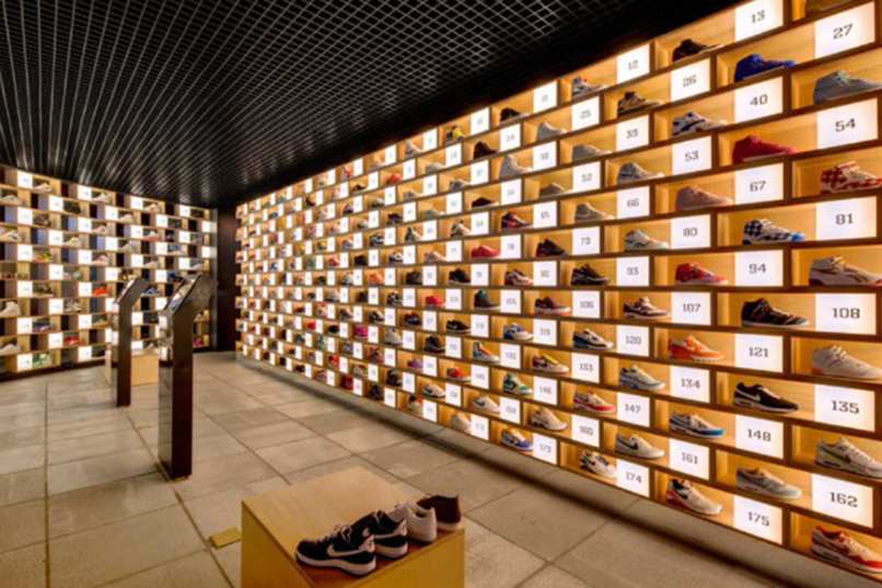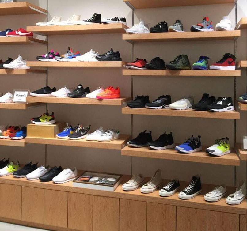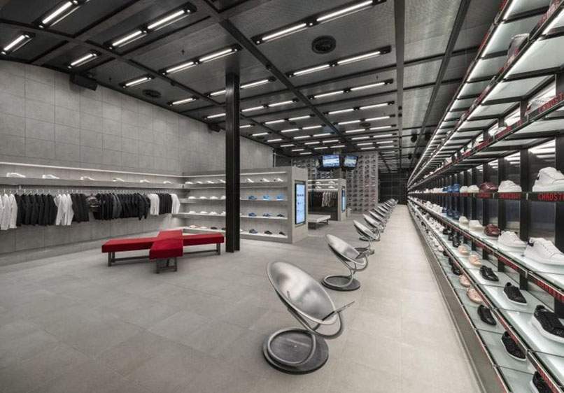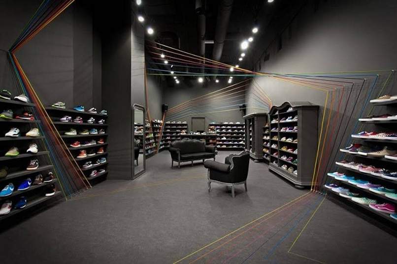Nếu shop bạn kinh doanh về giày thể thao thì nên ưu tiên những thiết kế nội thất có hoạ tiết viền, sọc với gam màu tối hay xám sẽ giúp shop bạn trông trẻ trung, năng động và mang lại cảm giác hài hoà giữa không gian, sản phẩm, màu sơn và nội thất của shop.