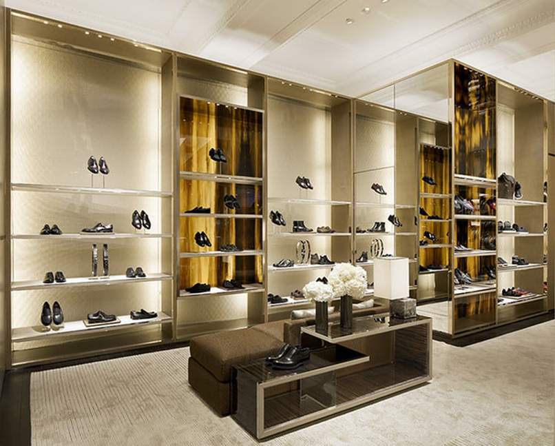- Đối với những shop giày dép nhỏ có không gian hạn chế, bạn nên tận dụng các vách tường để đặt tủ trưng bày nhằm đảm bảo không gian trong shop luôn thông thoáng, giữ lối đi thoải mái cho khách hàng.