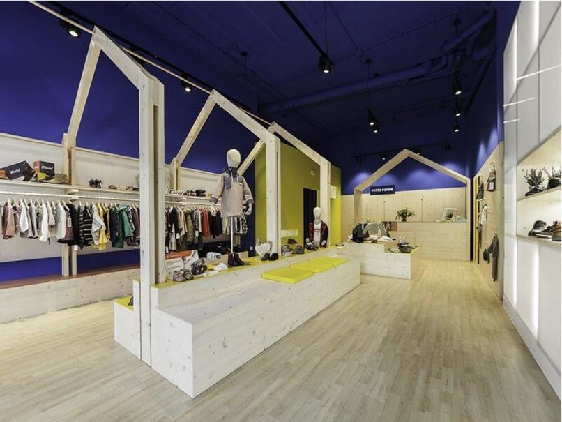 Không dùng vách ngăn nhưng lại thiết kế lối đi rộng rãi nghe có vẻ mâu thuẫn đúng không? Nhưng thực tế, đây là một bí quyết cần phải thực hiện khi thiết kế shop quần áo trẻ em diện tích nhỏ. Lối đi rộng rãi sẽ giúp thuận tiện cho việc mua sắm của khách hàng.