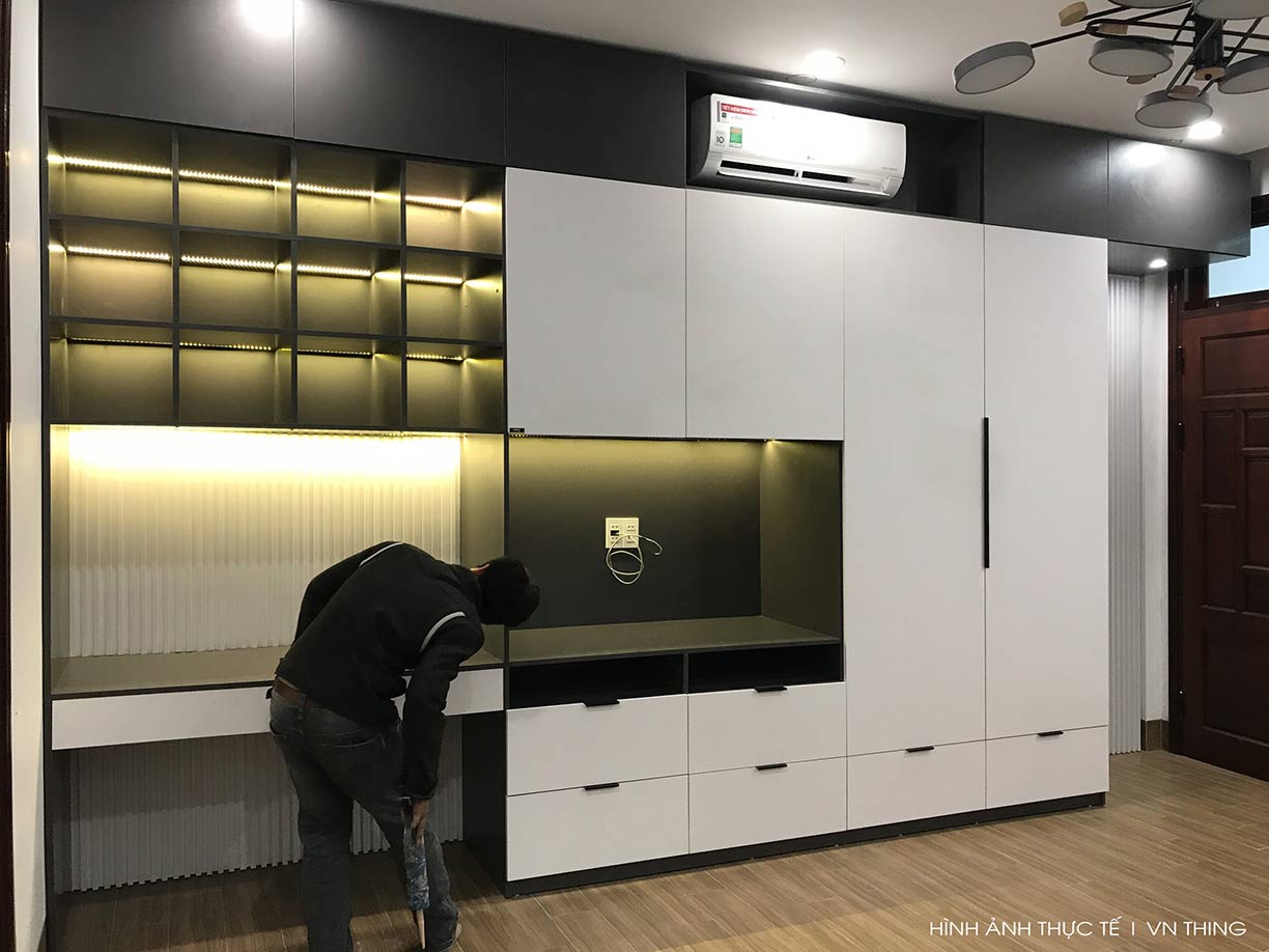 - Ốp lam sọc thủ công trang trí đầu giường và tủ quần áo. Khung xương MDF chống ẩm phủ Melamine An Cường 17mm; hậu 9 mm; lam 17x17mm