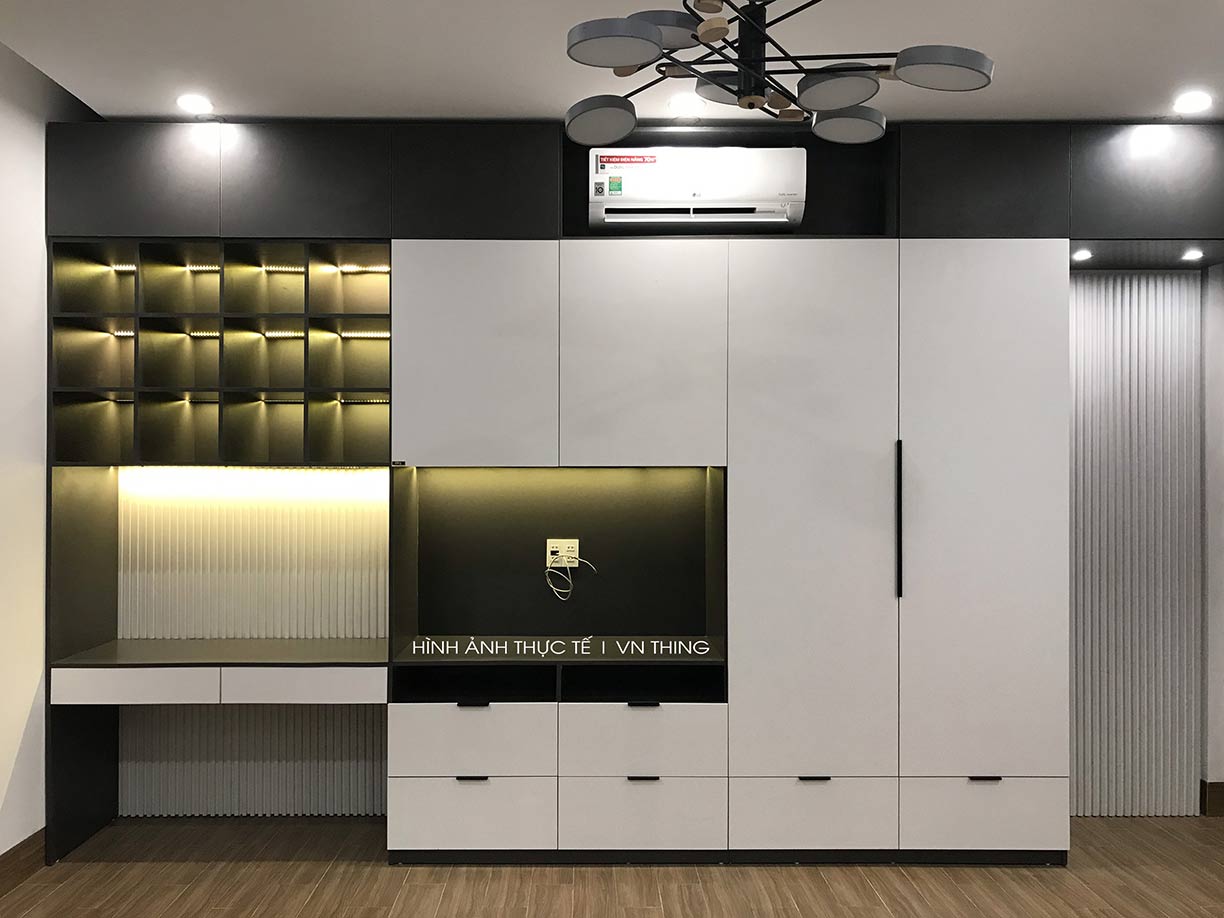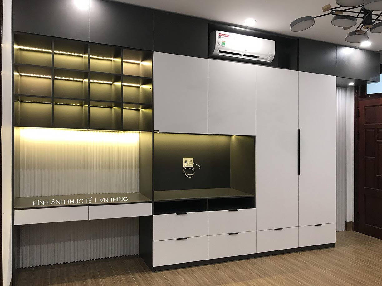 - Tủ quần áo kết hợp bàn làm việc, ô tủ để điều hòa được hoàn thiện bằng nhựa cao cấp