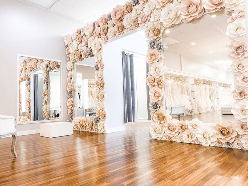 Bạn nên đặt gương ở khu vực phòng thử đồ, từ 3,4 cái cho cô dâu có nhiều góc nhìn hơn. Bên cạnh đó, để tăng độ sang trọng bạn có thể chọn khung gương bằng gỗ hoặc giả vàng. Việc bố trí gương hợp lý sẽ làm tăng thêm sự sang trọng, lung linh cho không gian.