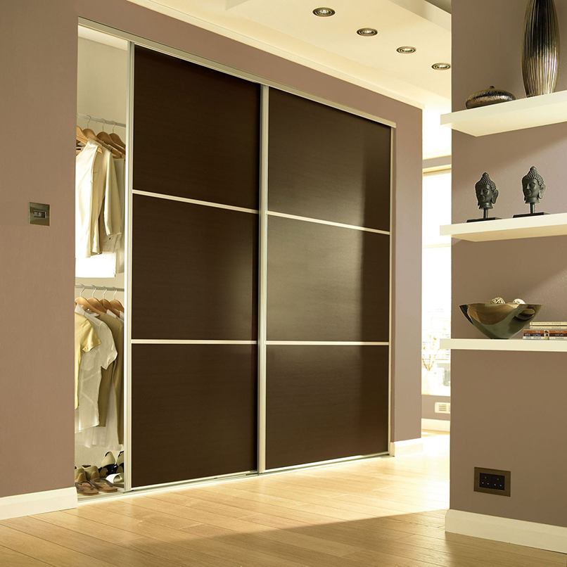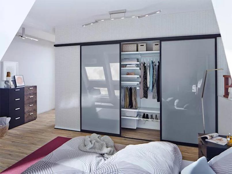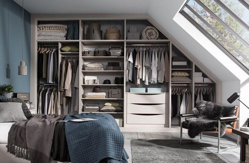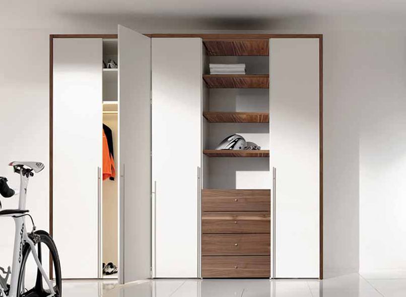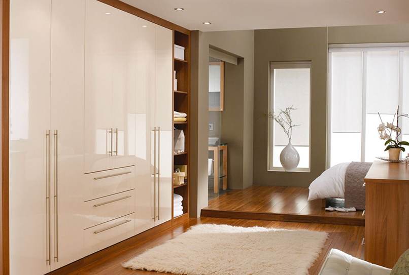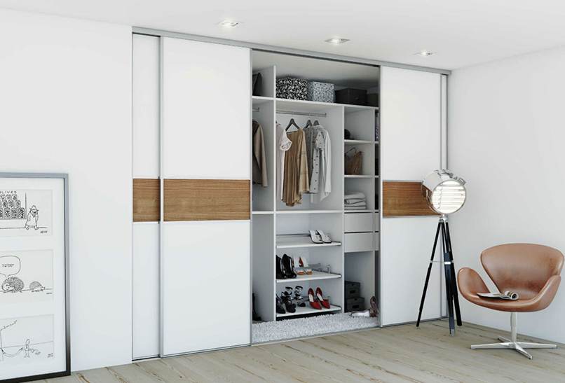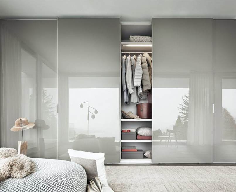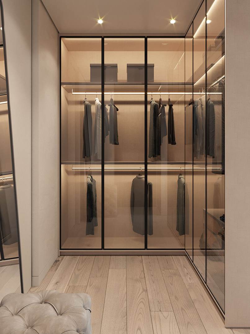 Đối với những không gian nhỏ hẹp thì nên đặt tủ theo hình chữ I hoặc chữ V, tức là một bức tường hoặc chạy dọc theo 2 bức tường tiếp giáp nhau. Bạn có thể dùng cửa trượt để làm rộng thêm cho không gian và thuận tiện cho việc đóng mở.