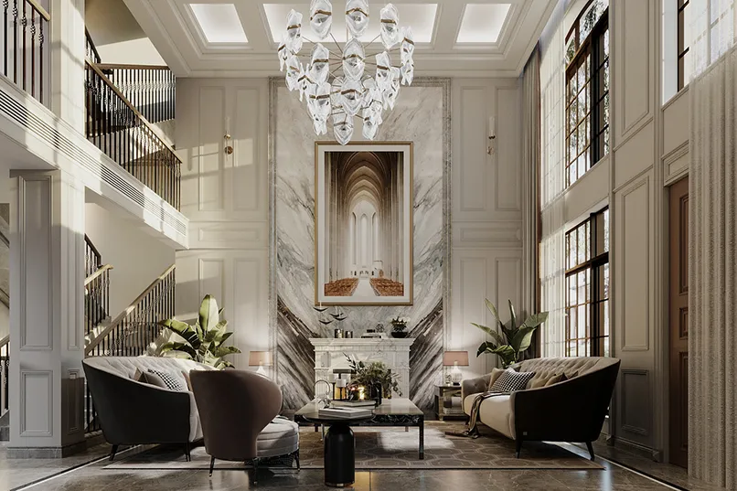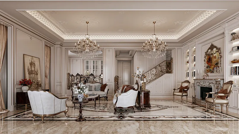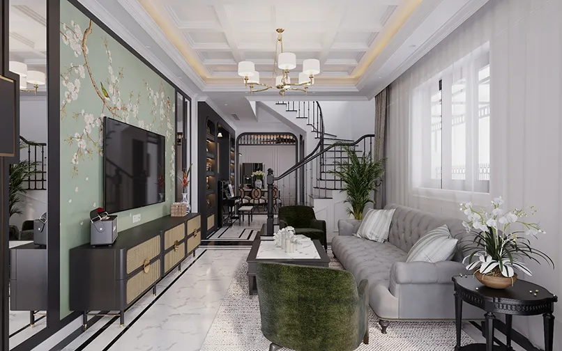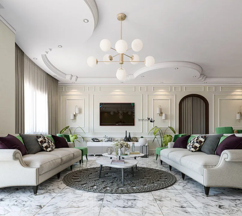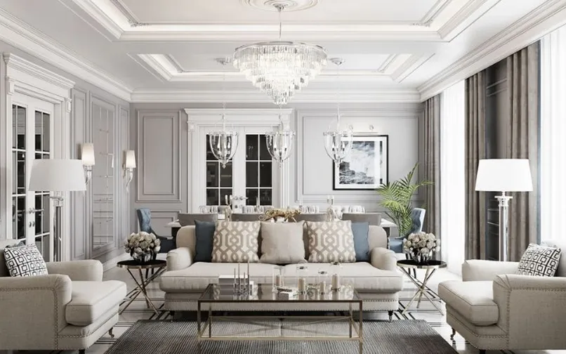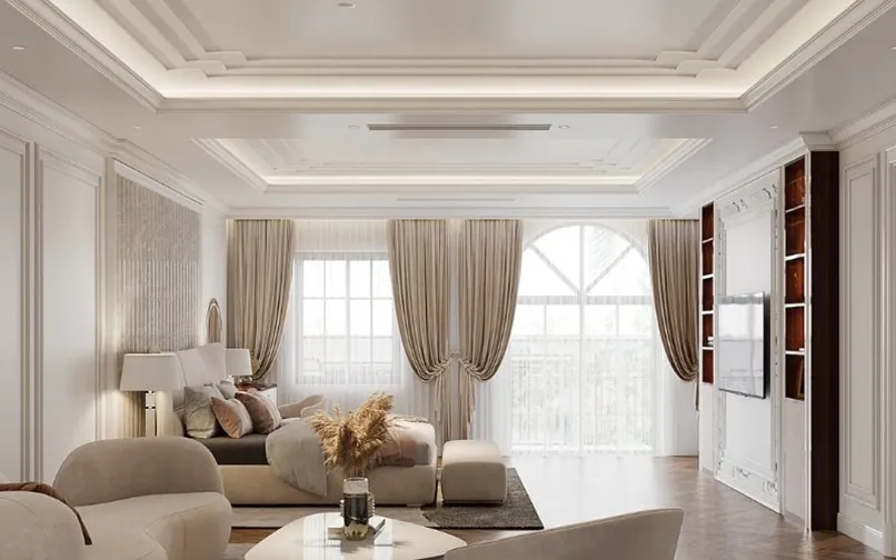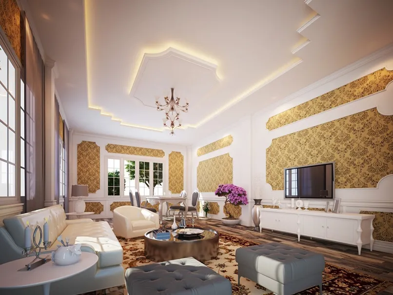 Đầu tiên, mẫu trần thạch cao giật cấp đơn giản phải có tính kết nối các khu vực của không gian lại với nhau. Cụ thể, nếu bạn thống nhất phong cách thiết kế cho phòng khách là cổ điển, nội thất cổ điển thì trần nhà thạch cao giật cấp cũng phải có hoạ tiết cổ điển.