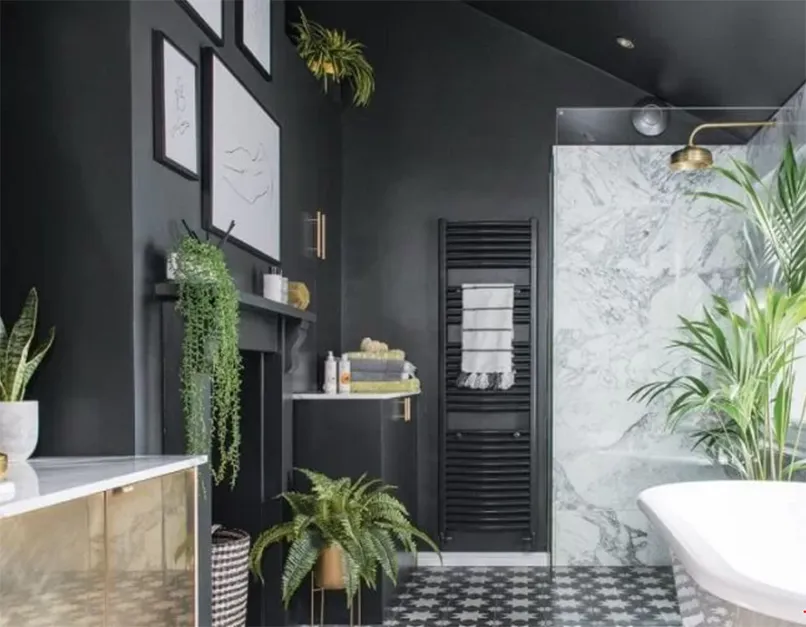 Dùng gam màu lạnh, tối đen sẽ làm nổi bật cây xanh một cách hoàn hảo. Phong nền nhà vệ sinh kết hợp với màu tự nhiên của thực vật sẽ tạo nên một vẻ đẹp mạnh mẽ.
