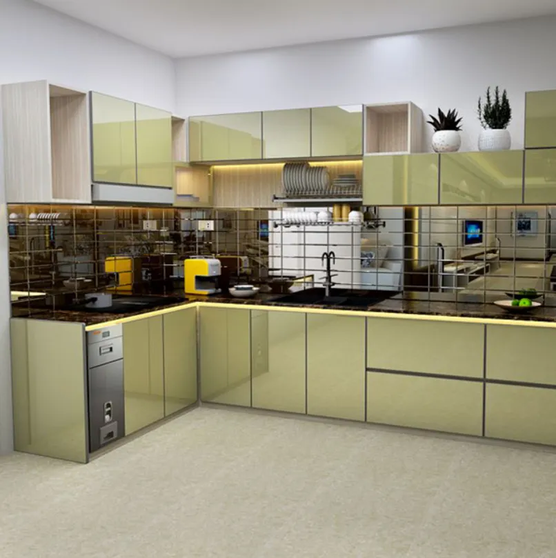 Tủ bếp hợp kim nhôm được cấu tạo từ những tấm hợp kim tráng men chống nước mạnh.