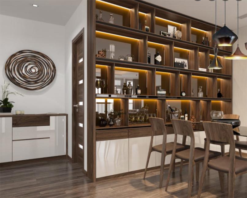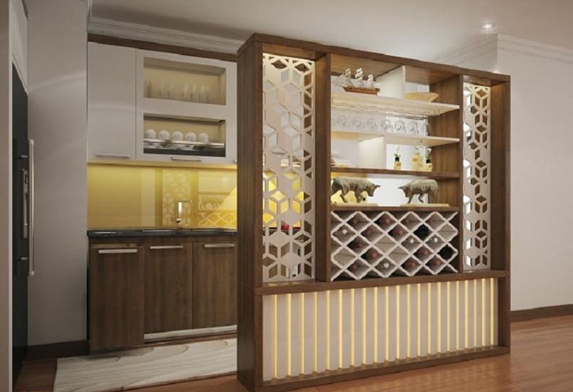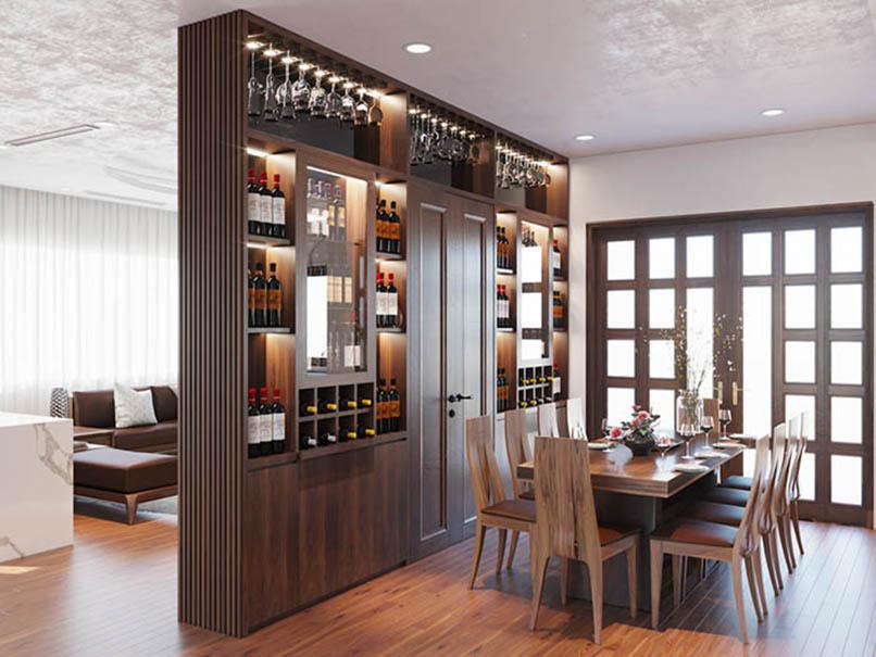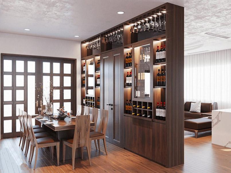 Thứ ba, tiết kiệm chi phí. Thay vì bỏ tiền ra để đặt hai món nội thất là tủ rượu và vách ngăn thì thiết kế 2 trong 1 luôn là lựa chọn quan trọng nhất khiến bạn tiết kiệm được kha khá chi phí trong không gian.