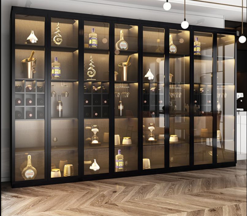 Đối với tủ rượu ngăn phòng khách và bếp bằng nhôm kính thì có độ thẩm mỹ cao, độ bền vượt trội với đa dạng kiểu dáng, mẫu mã. Giá của vật liệu này rẻ hơn nhiều so với gỗ tự nhiên nhưng độ bền, tính thẩm mỹ cũng không kém cạnh. Vì thế chất liệu này được dùng nhiều cho những gia đình muốn tiết kiệm không gian và sự lấp lánh.
