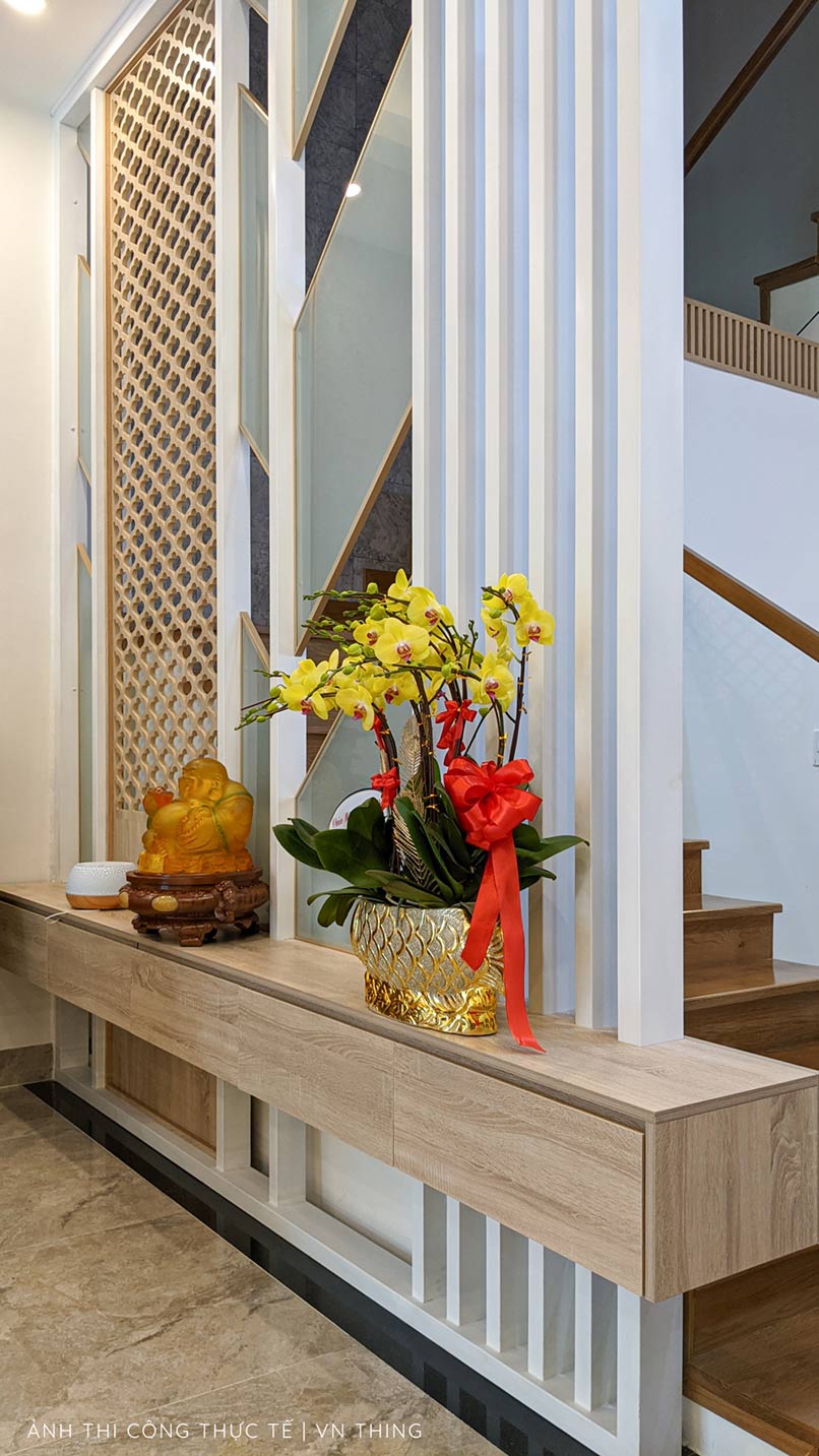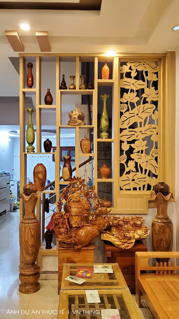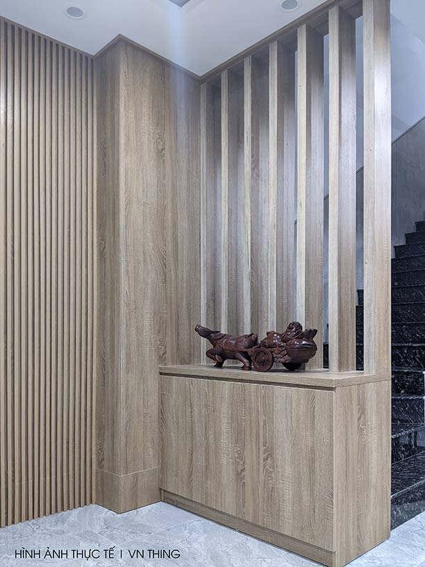 Đó có thể là vách ngăn gỗ, lam trang trí, kính, họa tiết CNC, kệ để đồ,… hoặc tất cả phối hợp thành một. Như công trình nội thất tại Hải Châu, Đà Nẵng bên dưới.