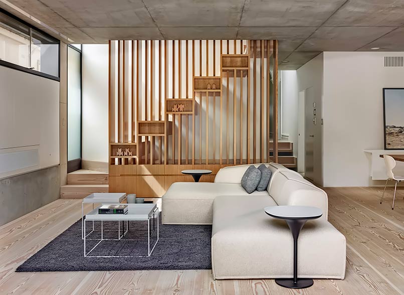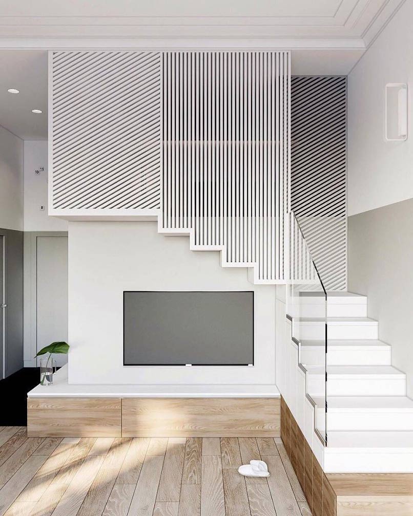 Trong thiết kế nội thất hiện đại ta hay bắt gặp những thiết kế không gian liên thông với nhau một cách tự nhiên. Cách thiết kế này phổ biến trong những căn nhà có diện tích hạn chế như những căn chung cư, nhà diện tích nhỏ…Trong đó vách ngăn cầu thang ngày càng được ưa chuộng hơn cả vì nó có thể che đi khuyết điểm của cầu thang và tăng tính thẩm mỹ cho phòng khách.