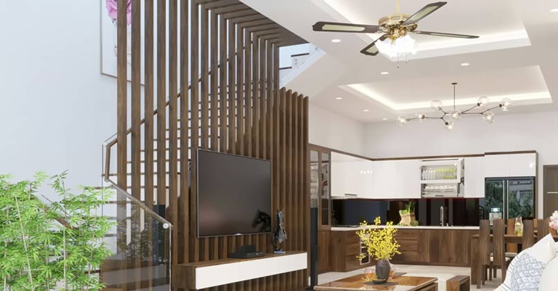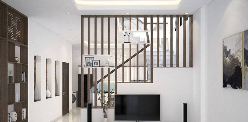 Thứ năm, tạo không gian thoáng đãng, tiết kiệm không gian. Vách ngăn cầu thang với phòng khách sẽ tạo nên một không gian thoáng đãng, các không gian thông với nhau một cách tự nhiên. Nhờ những vách ngăn này mà gia chủ cũng như người thân sẽ không có cảm giác bí bách như khi có một bức tường.