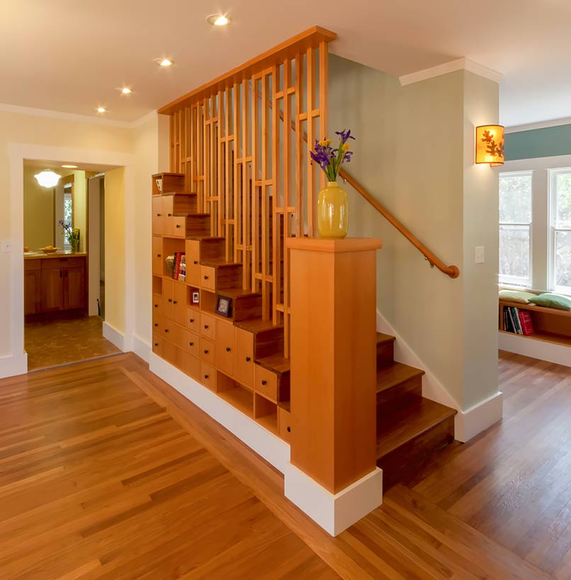 Để tránh sự đơn điệu, nhàm chán thì hiện nay các loại lam cầu thang thường được kết hợp với kệ trang trí tạo nên những nơi lưu trữ, trang trí mới.