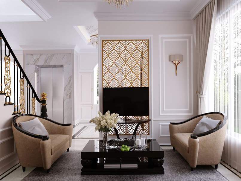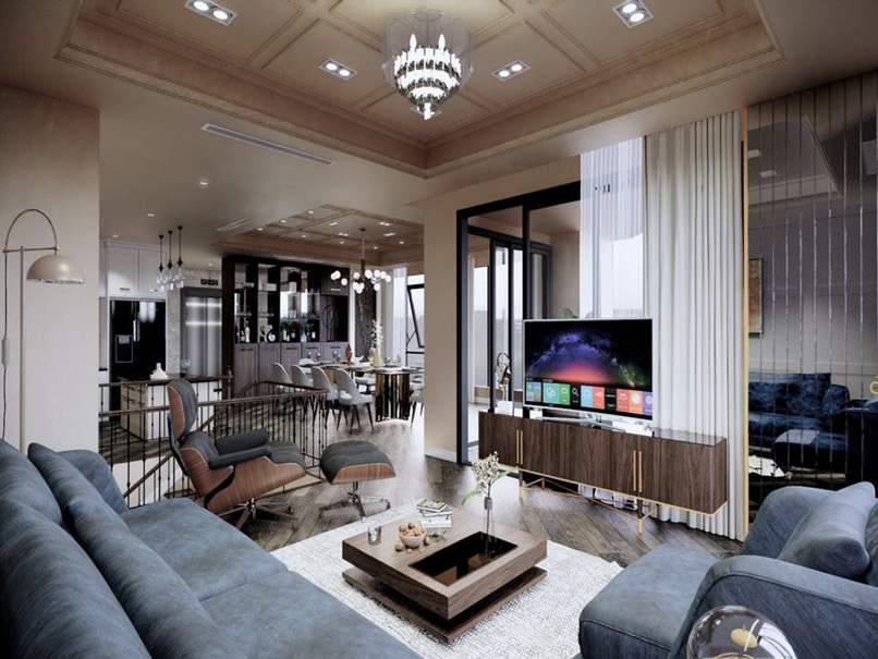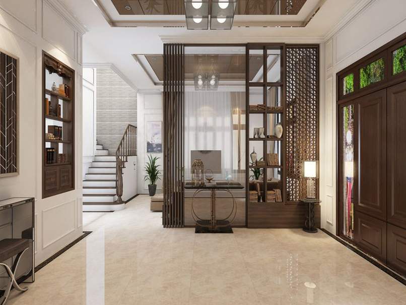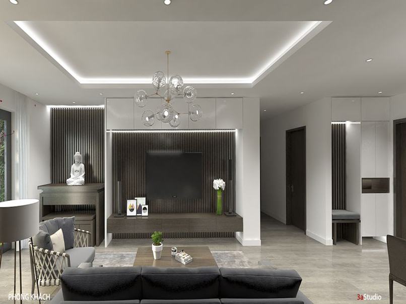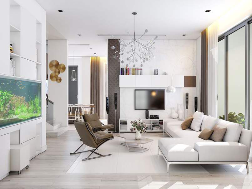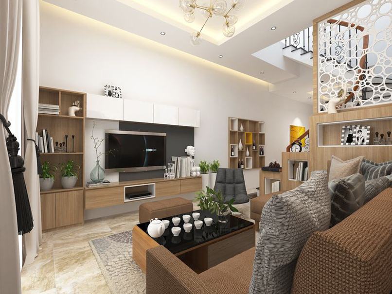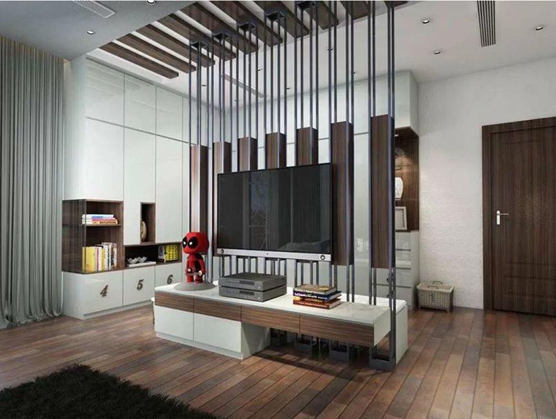Thứ hai, đặt vách ngăn đúng cách để không ảnh hưởng đến kiểu dáng thiết kế. Bạn nên cân nhắc vách tivi phòng khách hiện đại đặt ở nơi đảm bảo công năng và thẩm mỹ. Cũng nên chọn vách ngăn kết hợp kệ hoặc kiểu các nan gỗ thưa để tạo sự thoáng đãng, nhẹ nhàng, xuyên suốt cho phòng khách.