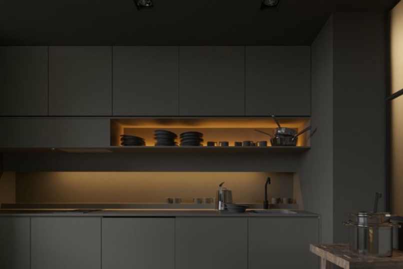 Thứ nhất, bố trí ánh sáng trên đầu tủ. Kiểu chiếu sáng này cho bạn một cảm giác nhẹ nhàng vào buổi sáng sớm hoặc buổi tối. Những chậu cây, bình,… được đặt ở vị trí này sẽ mang lại sắc thái mỹ miều rất nhiều. Bạn cũng có thể sử dụng ánh sáng vùng tại chỗ bên dưới bếp, thay vì ánh sáng cho tủ bếp đều có thể được đặt trong bộ dimable để có nhiều ánh sáng hơn.