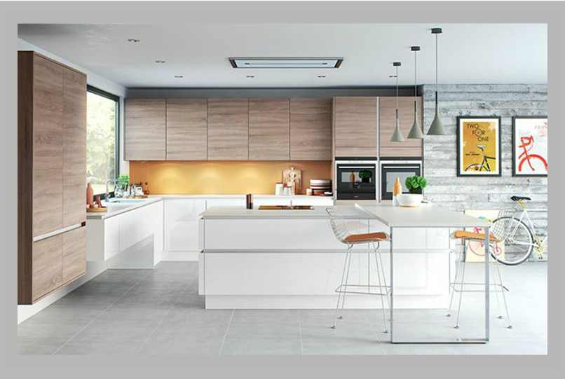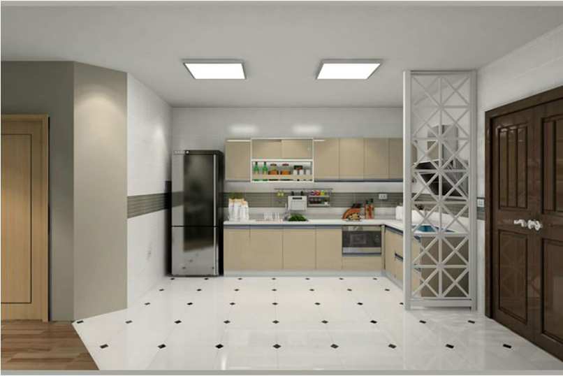 Thứ ba, hệ thống đèn từ trần nhà. Bạn có thể bật tủ bếp bằng đèn rọi từ trần nhà. Một điều cần lưu ý là phần ánh sáng đập vào mặt cảnh tủ sẽ dễ bị chói như: tủ kính, tủ Acrylic hay sơn bóng… Nguồn ánh sáng này cũng giúp bạn thấy được những gì bên trong tủ khi mở ra.