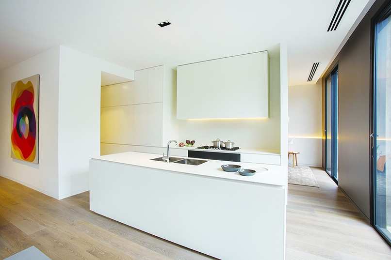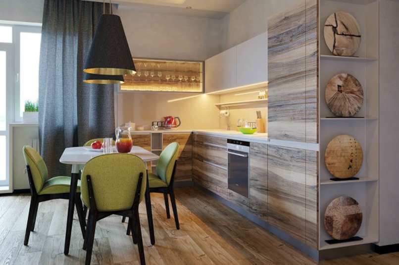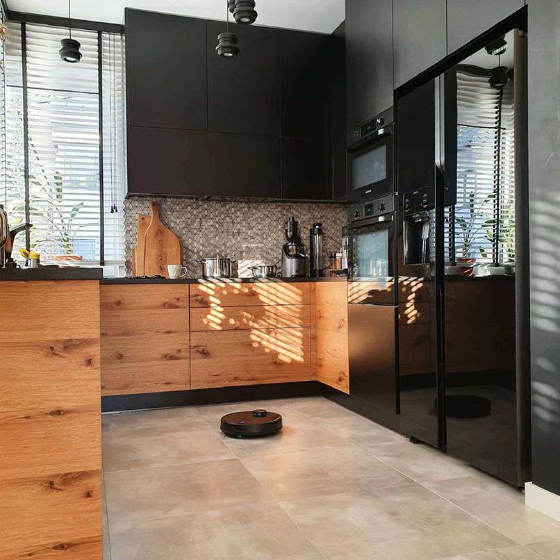 Tám, nhà bếp đẹp với ánh sáng dưới hốc chân tủ bếp. Phương án chiếu sáng này có thể giúp vệ sinh sàng một cách nhanh chóng, giúp mọi người di chuyển một cách dễ dàng. Có thể dùng đèn LED hay dây đèn mắt ếch để không gian trở nên linh lung.