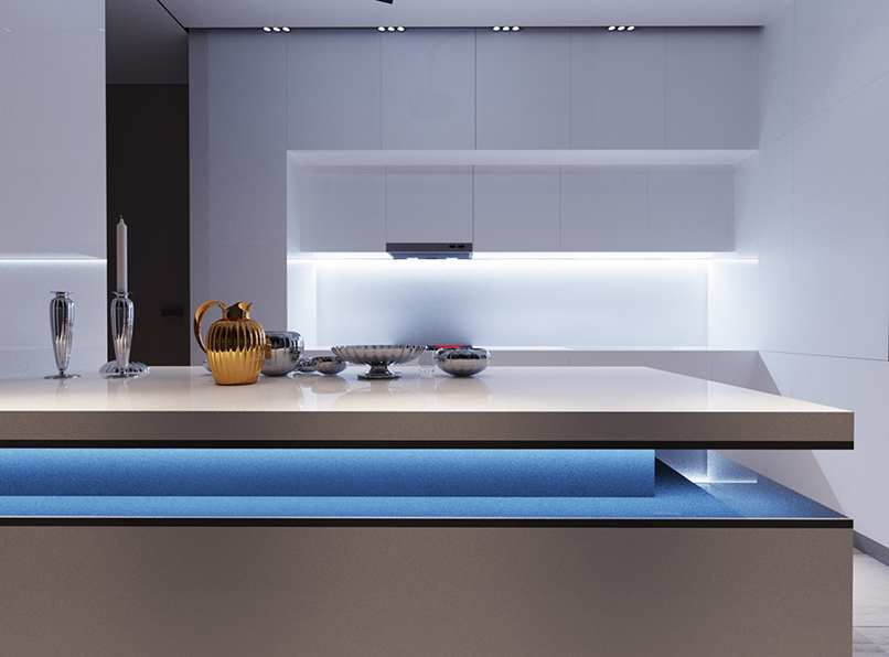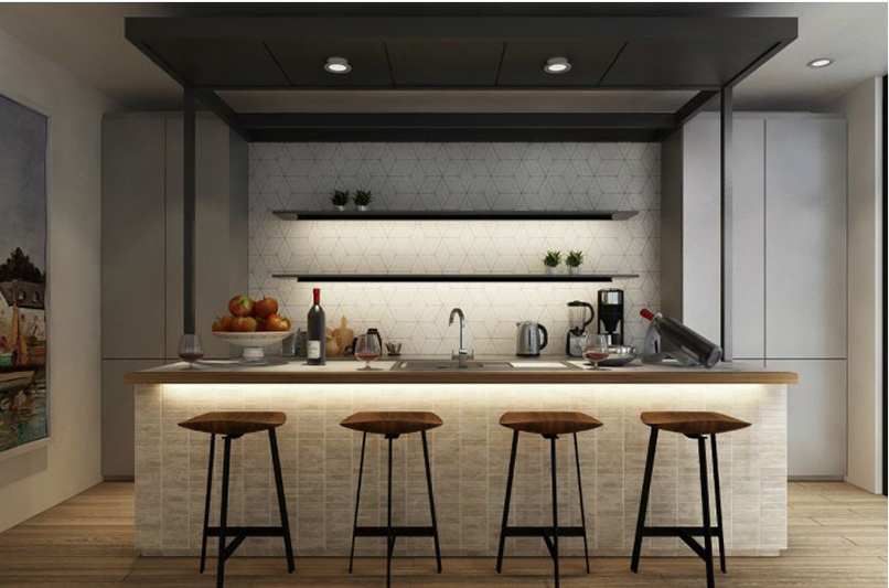 Thứ tư, hệ thống chiếu sáng từ phía Backsplash. Thông thường đối với phần này thường dùng đèn led chạy dọc xung quanh để nó hắt ra ánh sáng dịu nhẹ, khiến cho màu của backsplash trở nên nổi bật.